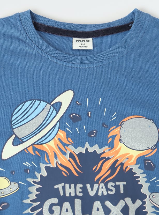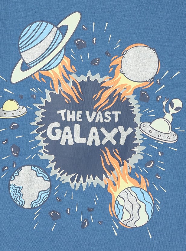 Add a fun twist to your kid's collection with this glow-in-the-dark T-shirt, highlighted with a cool space-themed graphic print. Designed with a crew neck and half sleeves, it's perfect for everyday adventures.