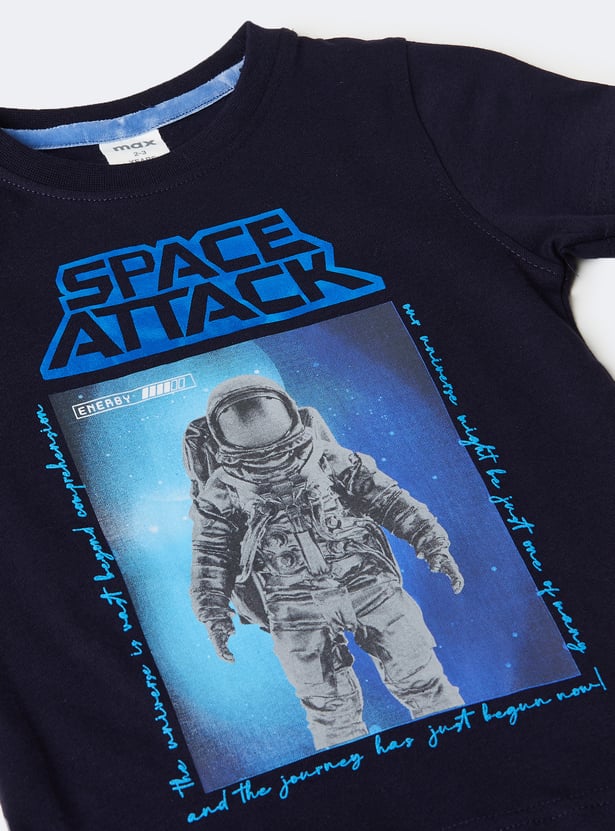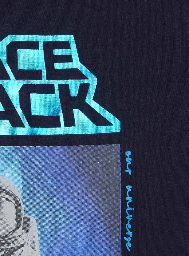 He’ll reach for the stars in this T-shirt. It features an eye-catching space-themed photo print at the front. Designed with a classic crew neck and half sleeves, it offers a comfortable look.