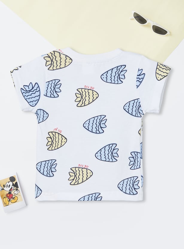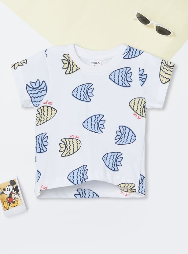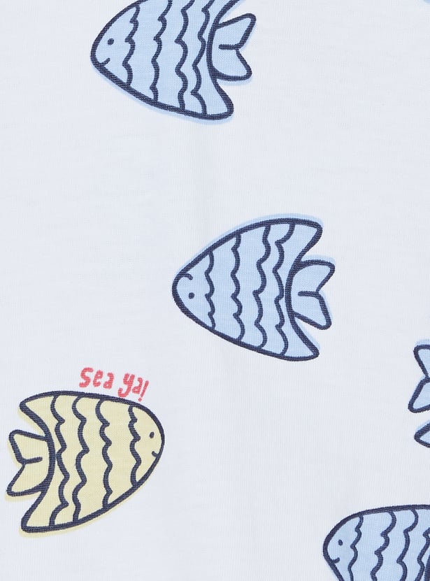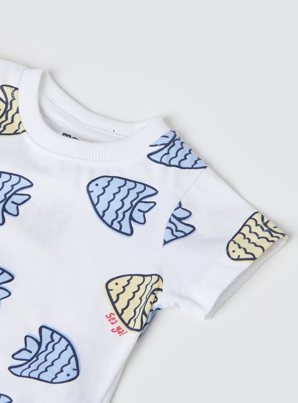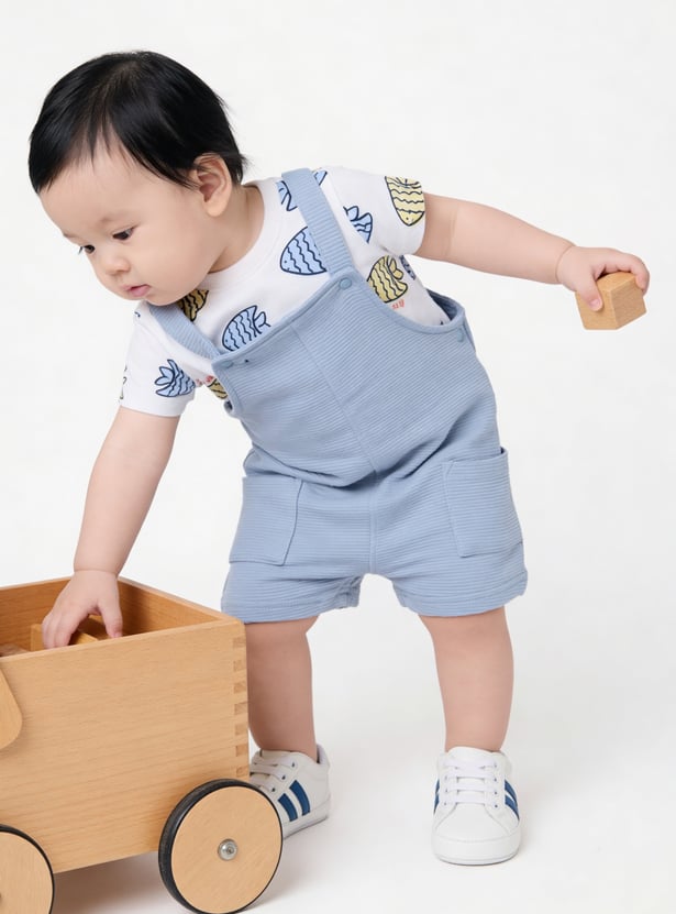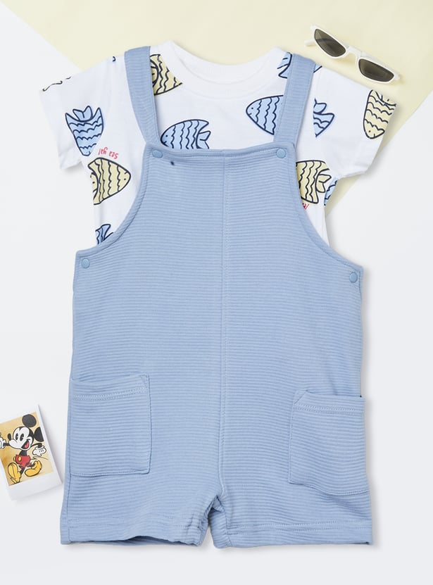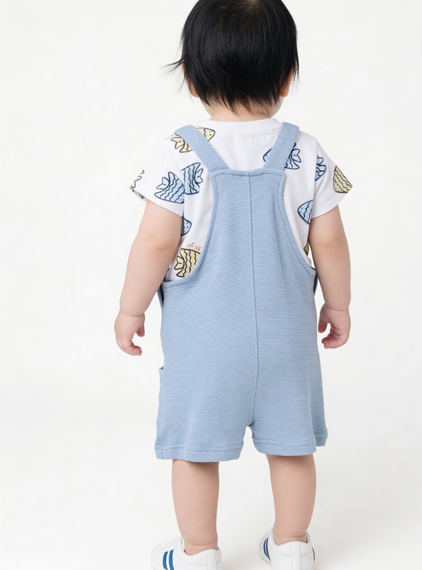 Bring playful layering to life with this knit romper set. The romper comes with suspenders and button closure for a classic, cozy look, while the printed t-shirt underneath features a crew neck and half sleeves for easy comfort.