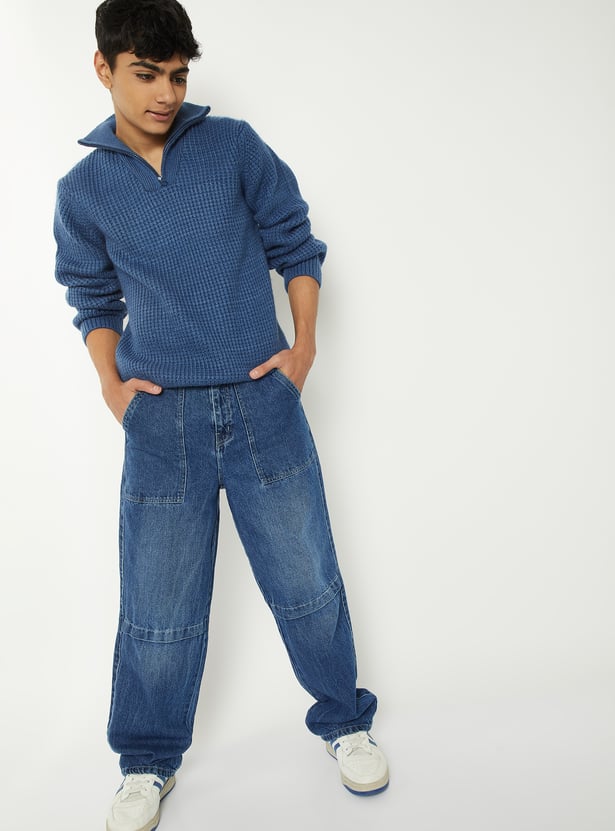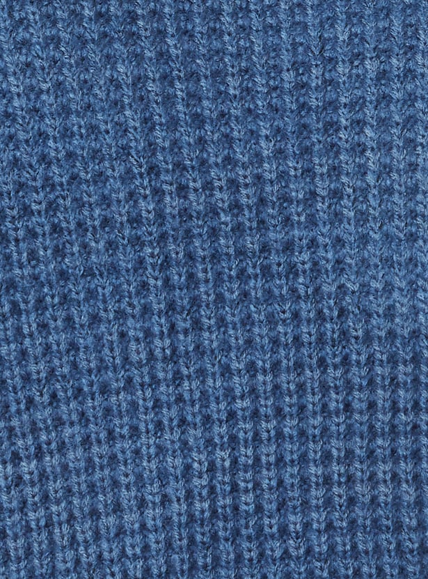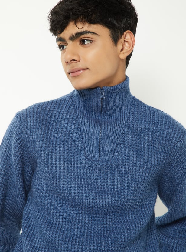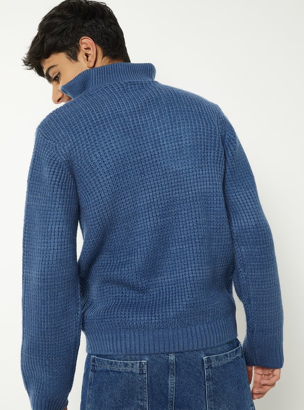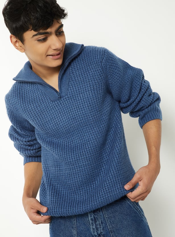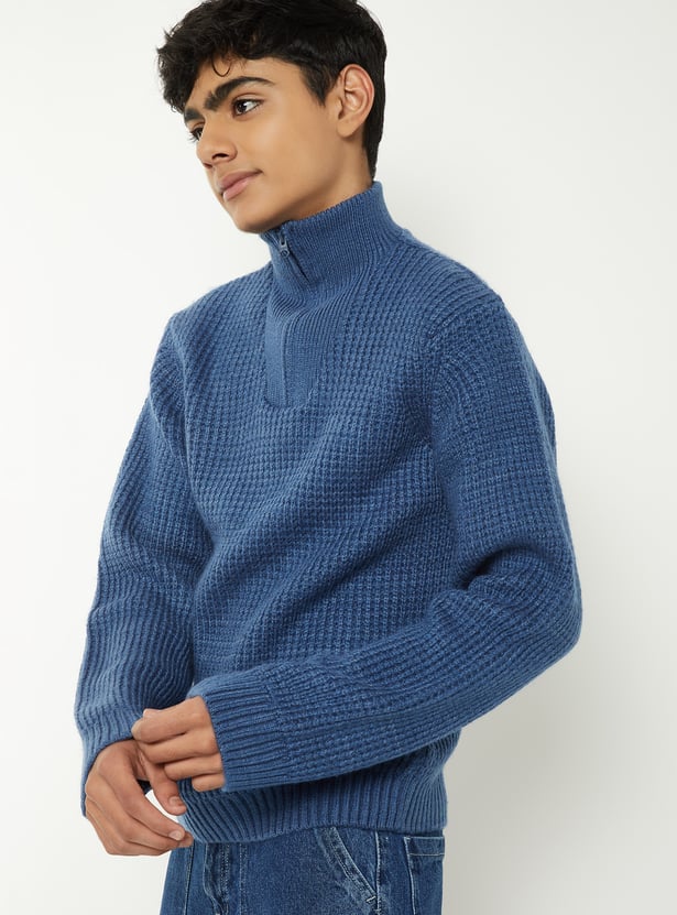 Stay warm in this cozy knit sweater featuring a high neck with zip closure, full sleeves, and a snug ribbed hem that keeps the fit structured.