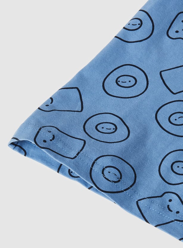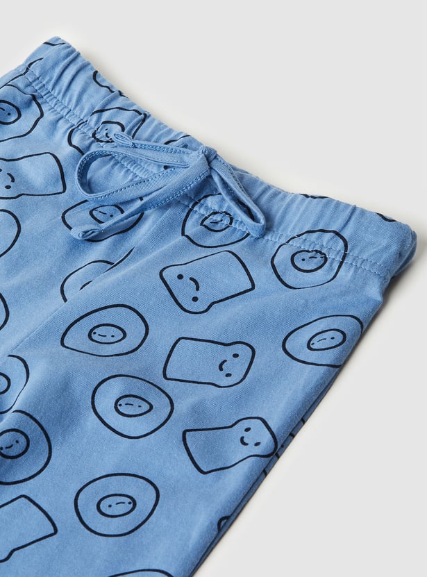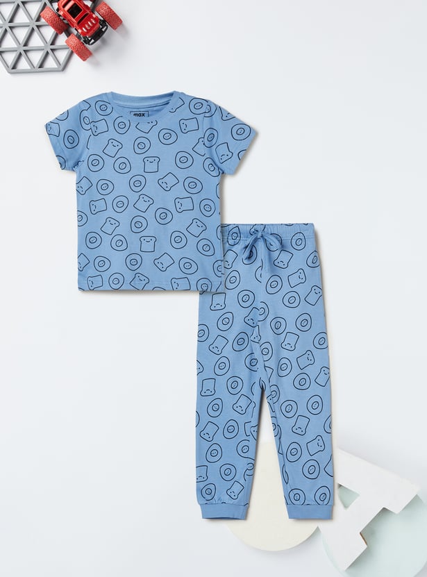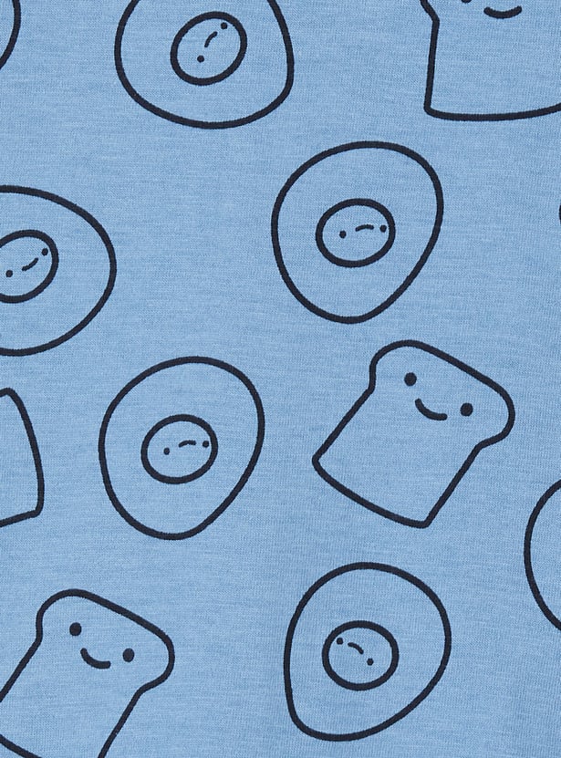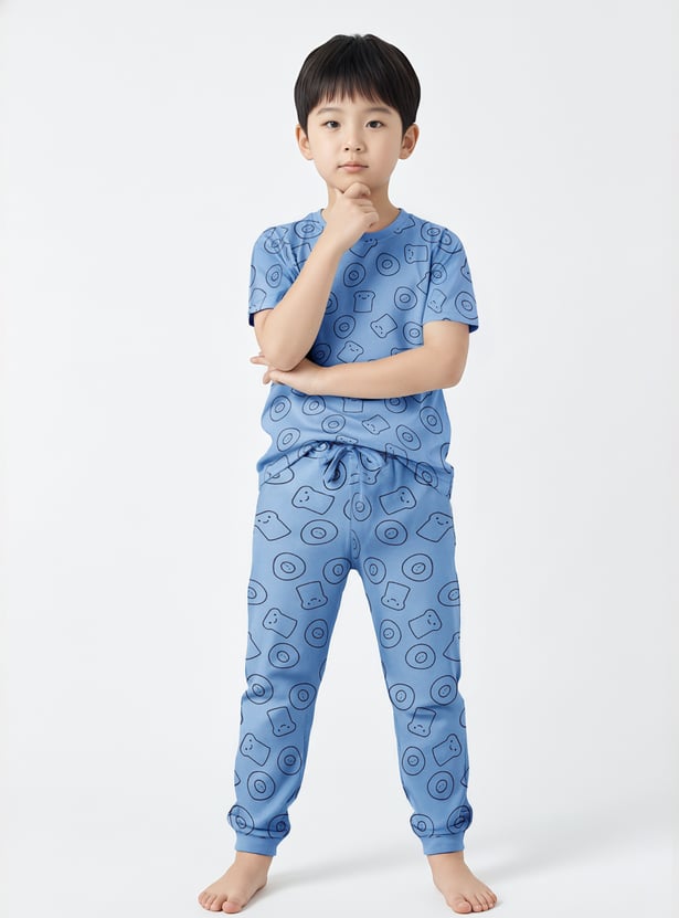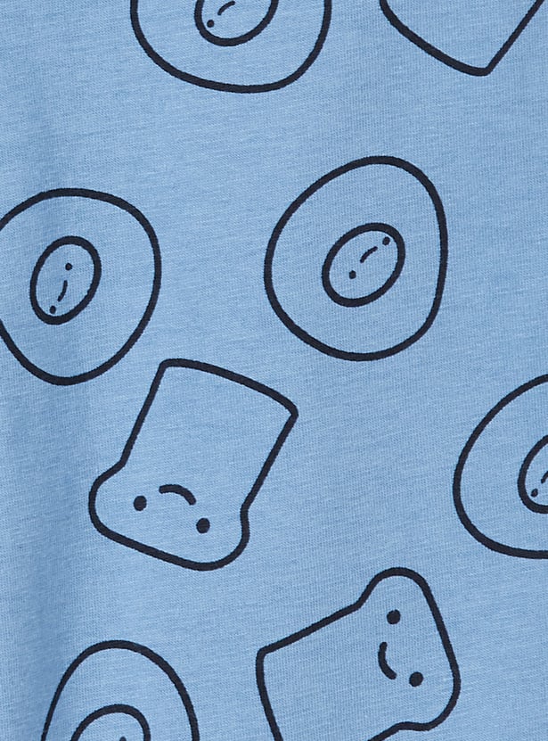 This printed PJ set includes a comfy printed t-shirt with half sleeves and a crew neck for a relaxed fit. The set is completed with printed joggers featuring a drawstring closure, offering both comfort and style for a cozy night in or lounging around the house.