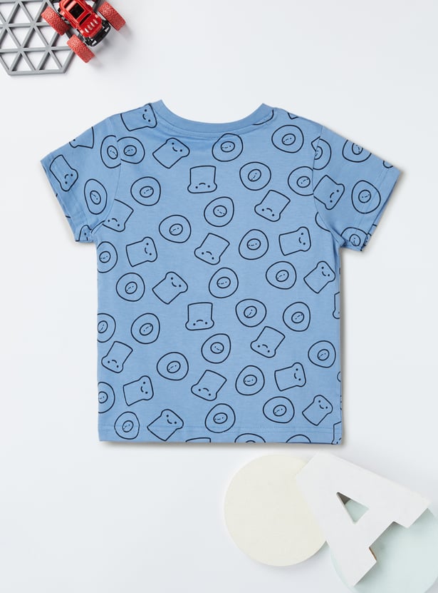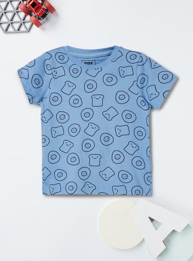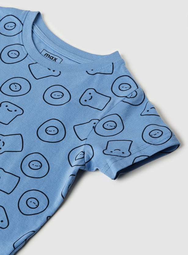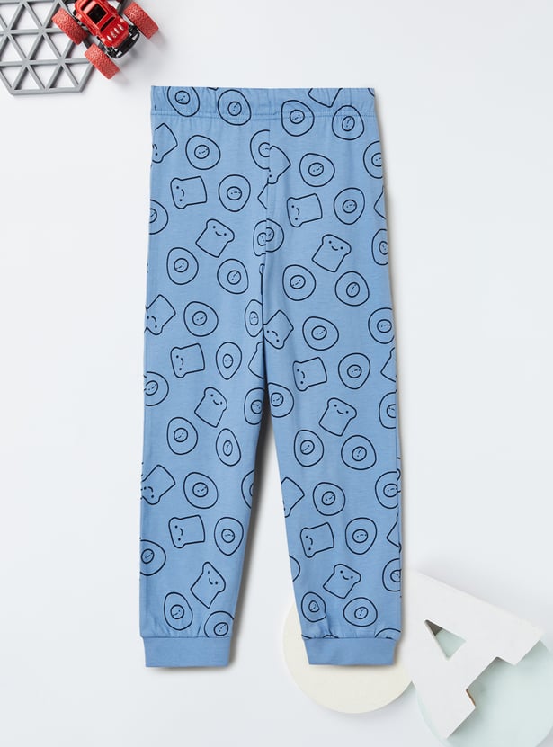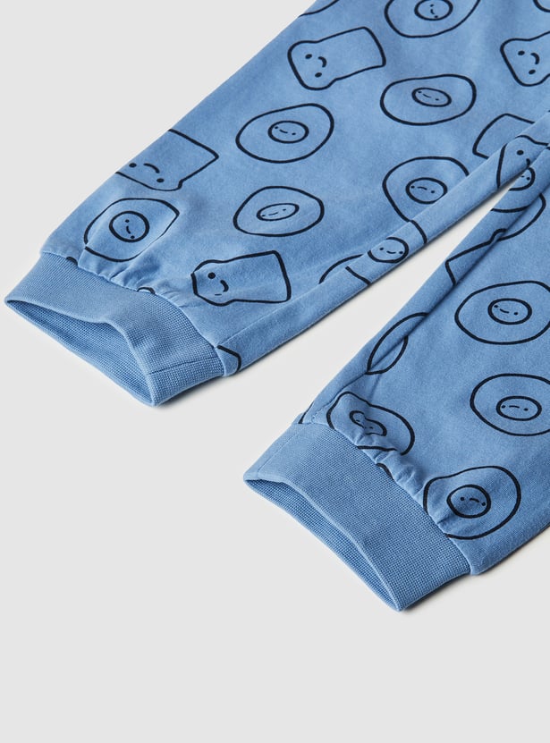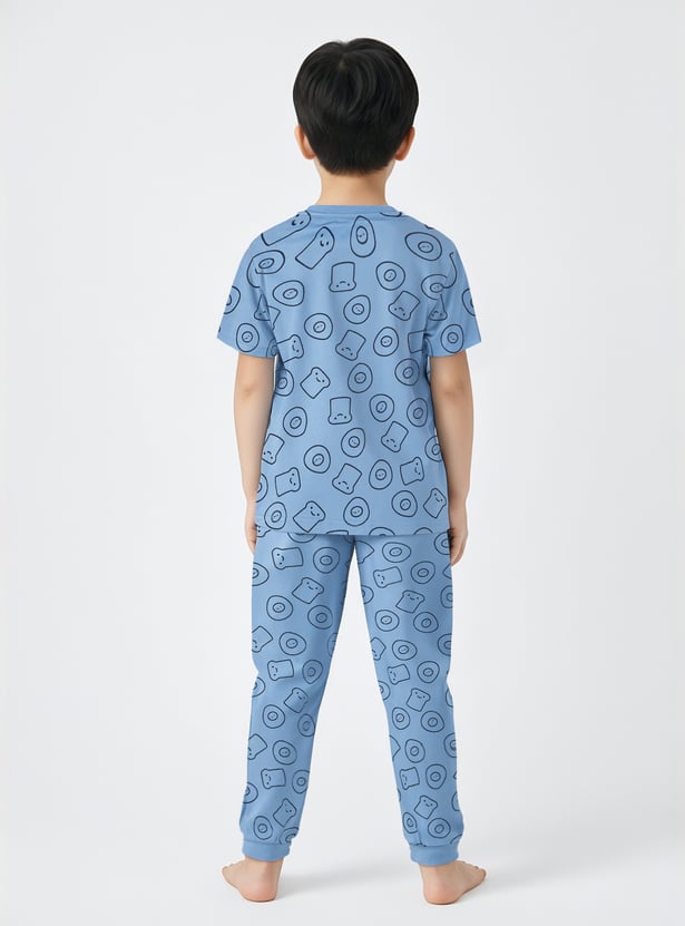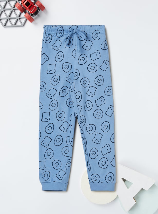 This printed PJ set includes a comfy printed t-shirt with half sleeves and a crew neck for a relaxed fit. The set is completed with printed joggers featuring a drawstring closure, offering both comfort and style for a cozy night in or lounging around the house.