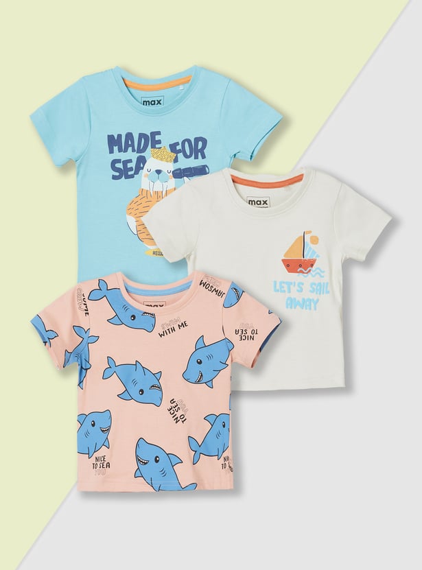 This pack of 3 printed T-shirts offers a stylish and comfortable addition to any wardrobe. Featuring a crew neck and half sleeves, they are perfect for everyday wear.