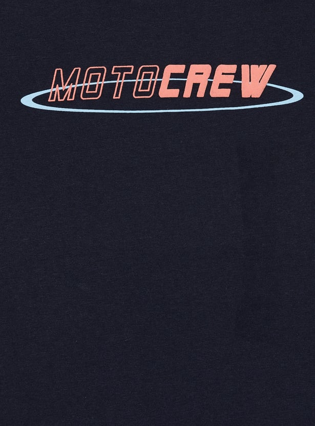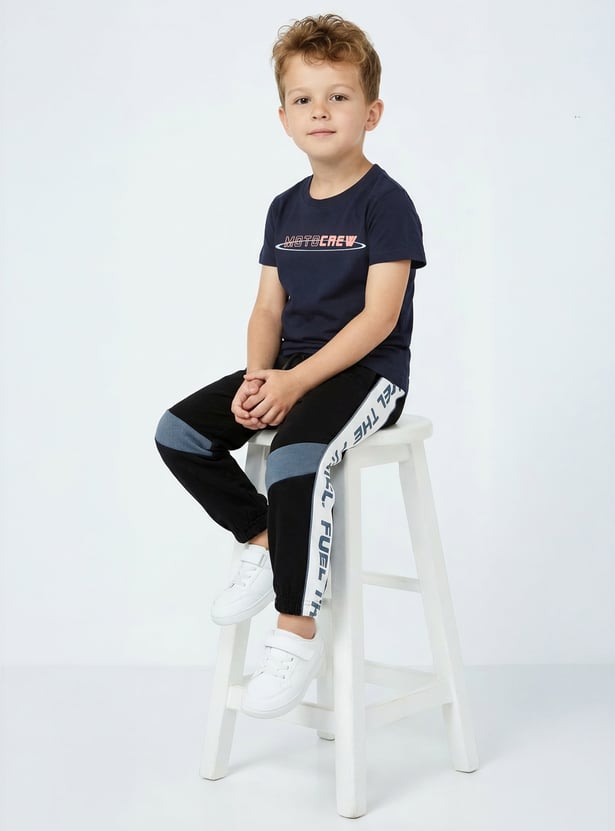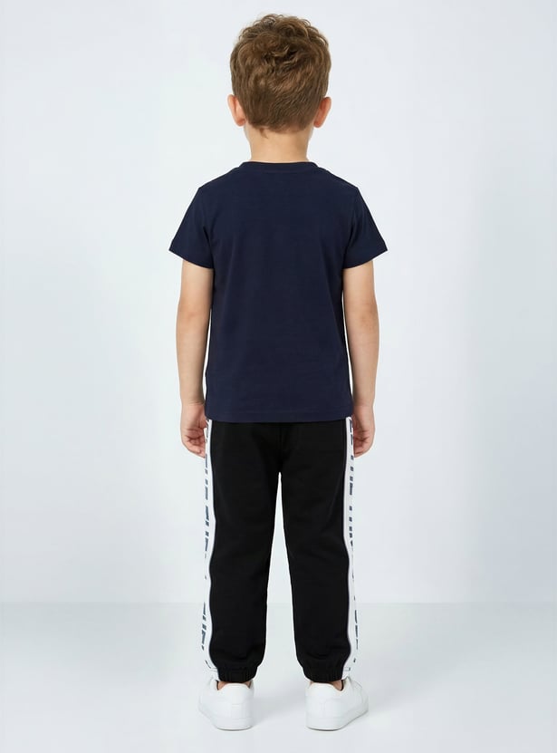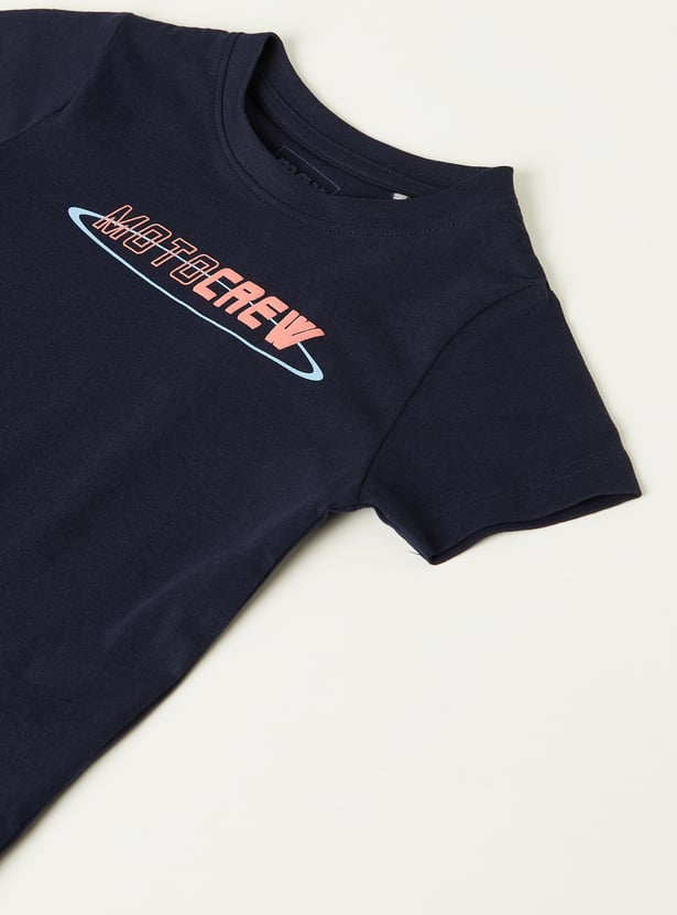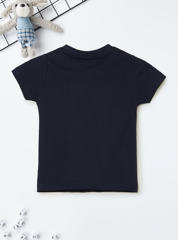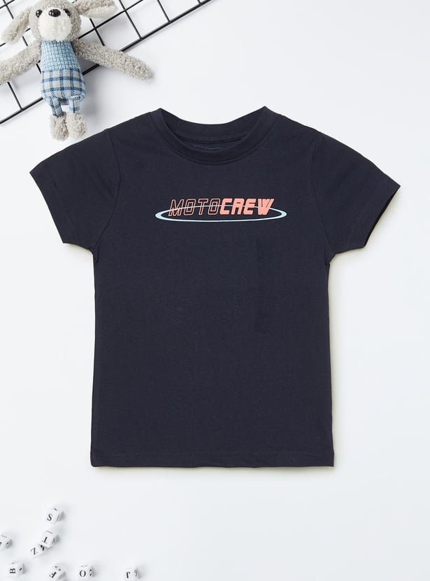 A printed T-shirt designed with a classic crew neck and comfortable half sleeves for day-long ease. The playful print and easy fit make it a reliable choice for school days, playtime, and casual wear.