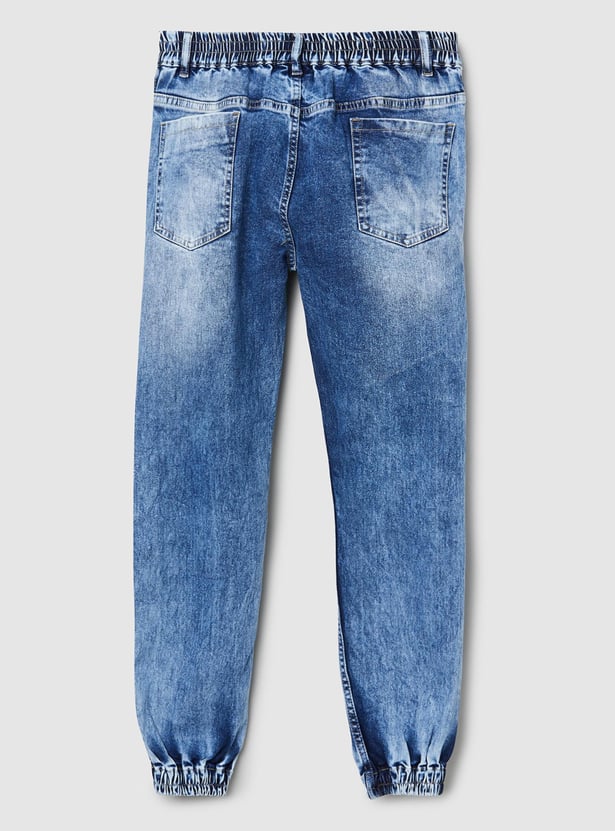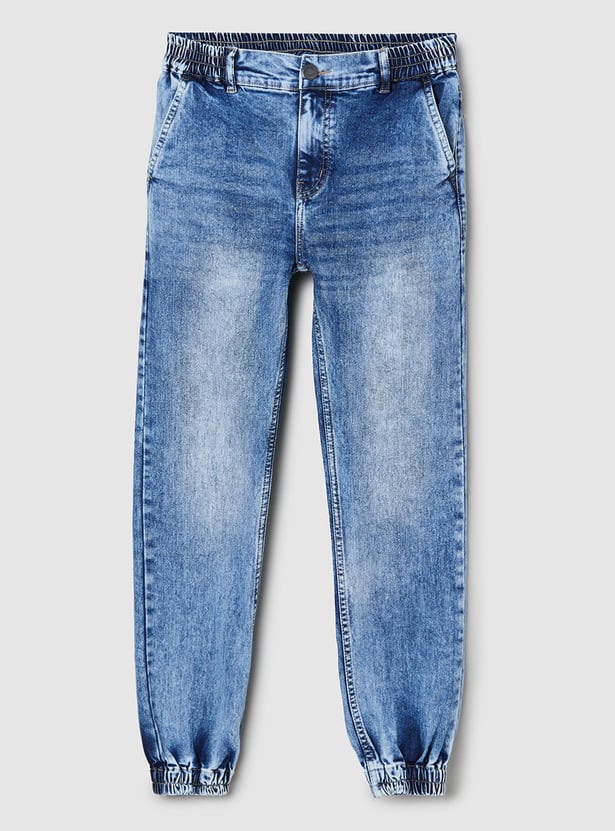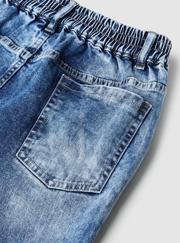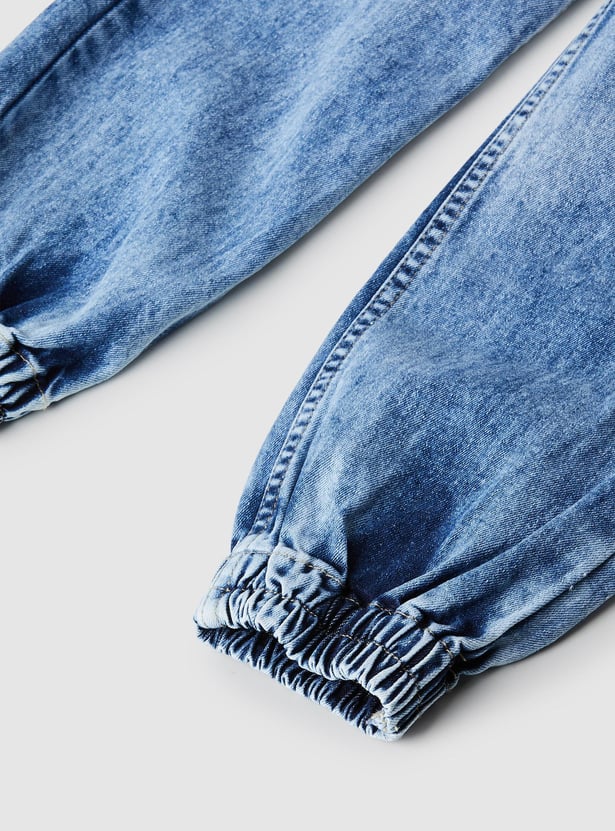 Spruce up your kid's wardrobe with these denim joggers. Designed with a washed surface, button closure, elasticated waistband, and pockets, they offer both style and comfort.