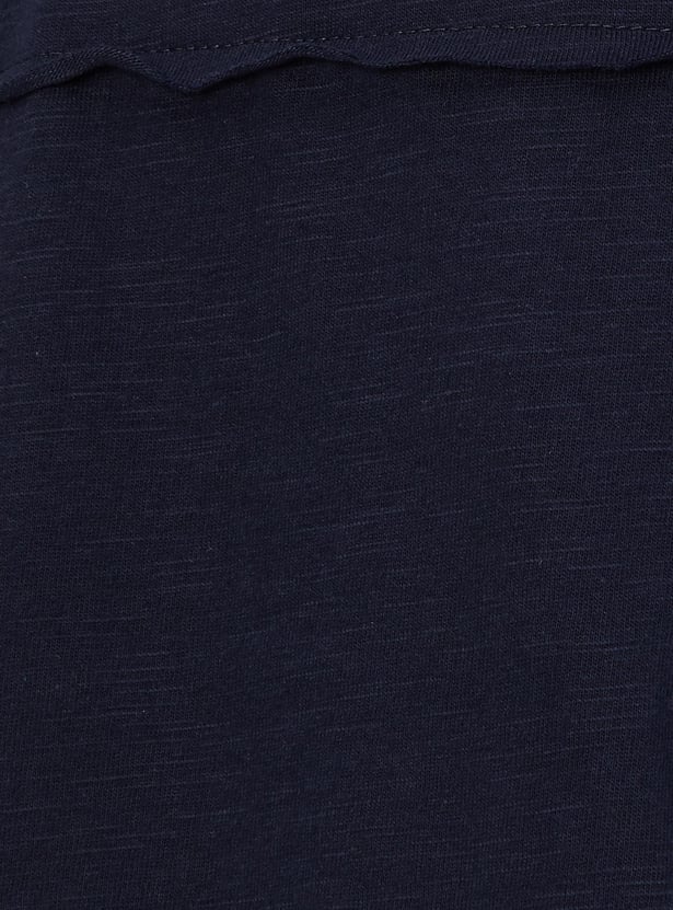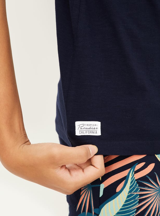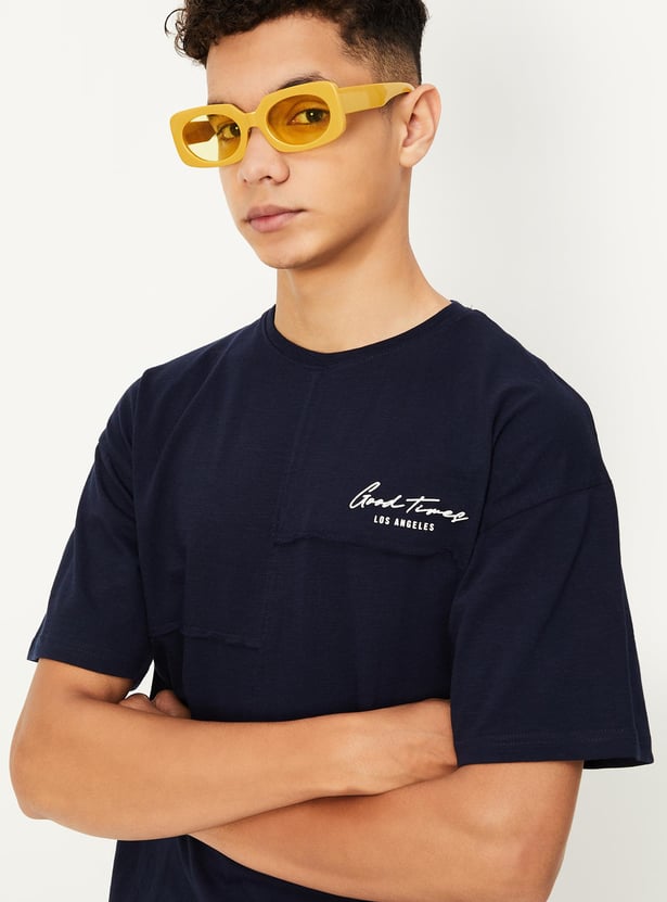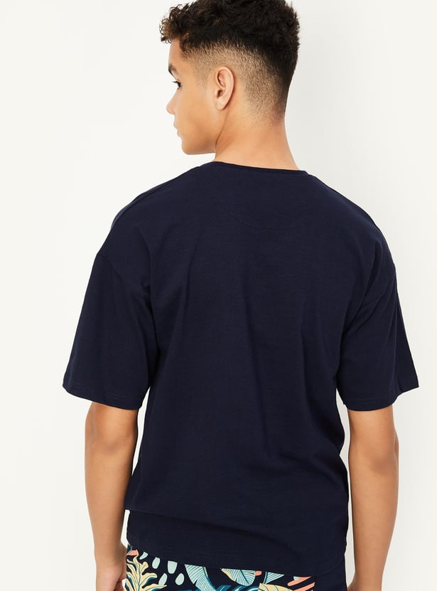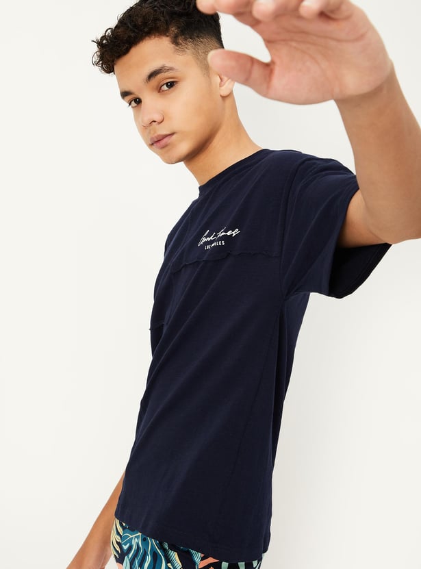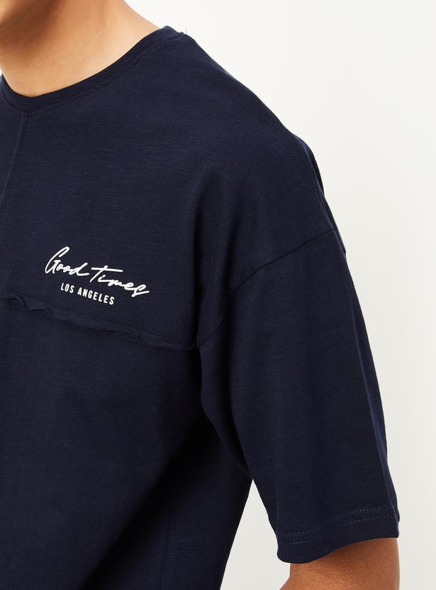 Build his basic wardrobe with this T-shirt. It is updated with a crew neck, drop shoulders, and half sleeves. The cut and sew detailing along with HD print at the chest complete the look.