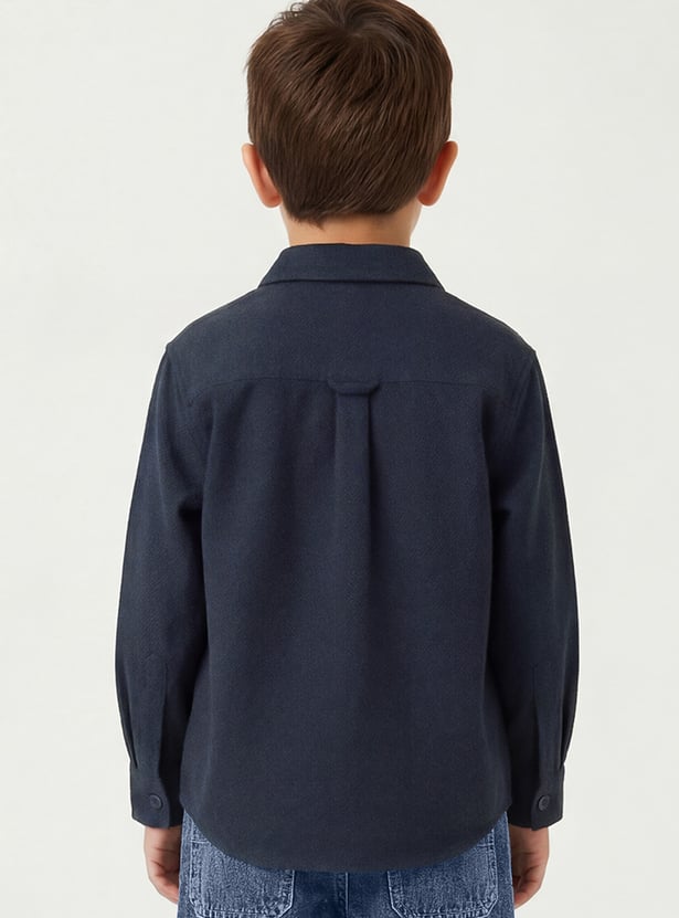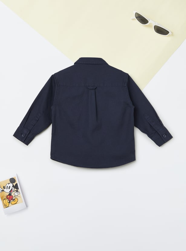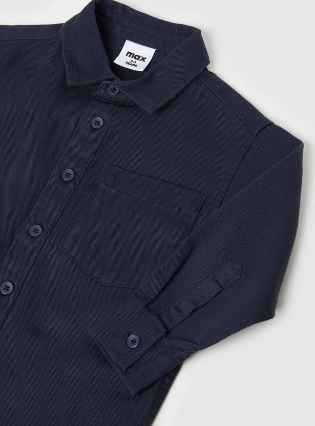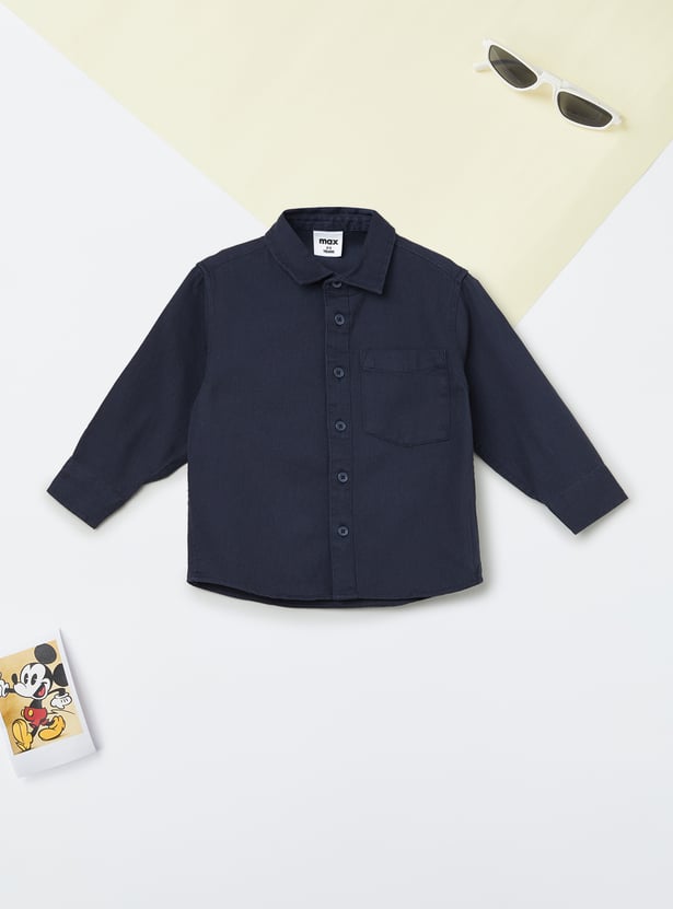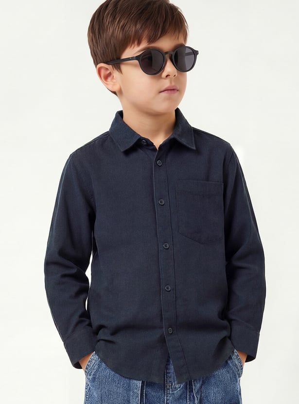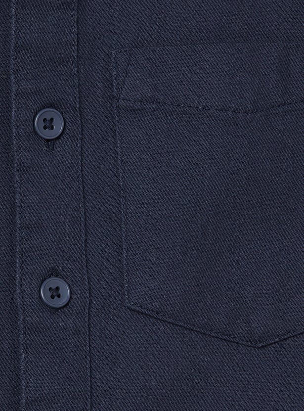 Timeless and versatile, this solid shirt is crafted with a spread collar, button placket, full sleeves with button cuffs, and a neatly placed patch pocket for added functionality and style.