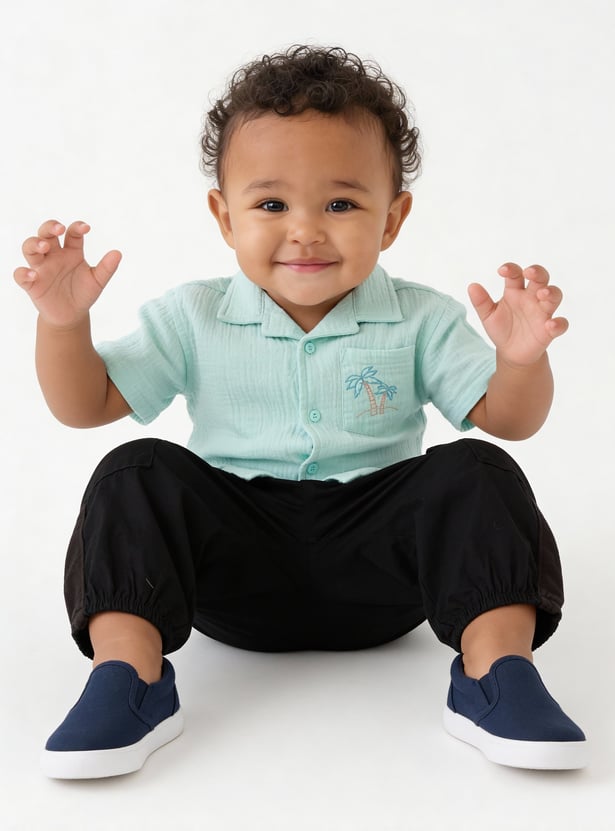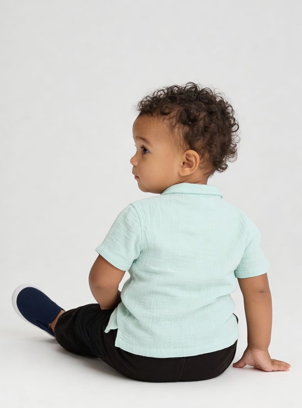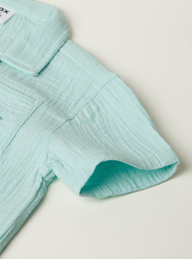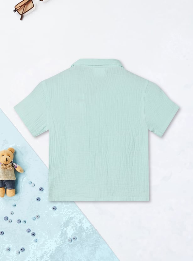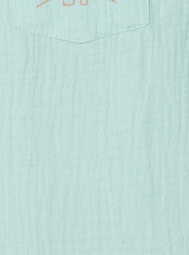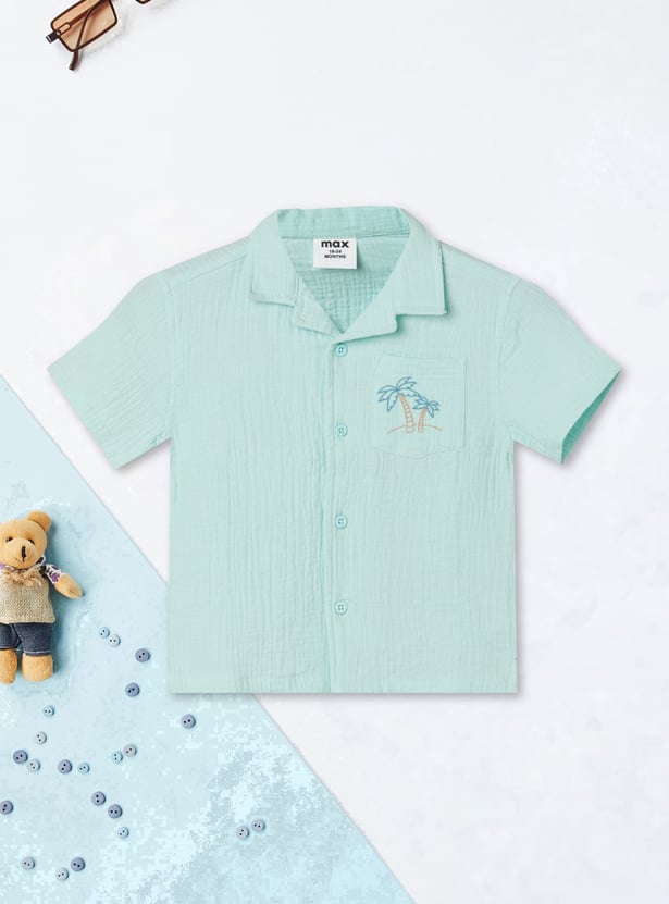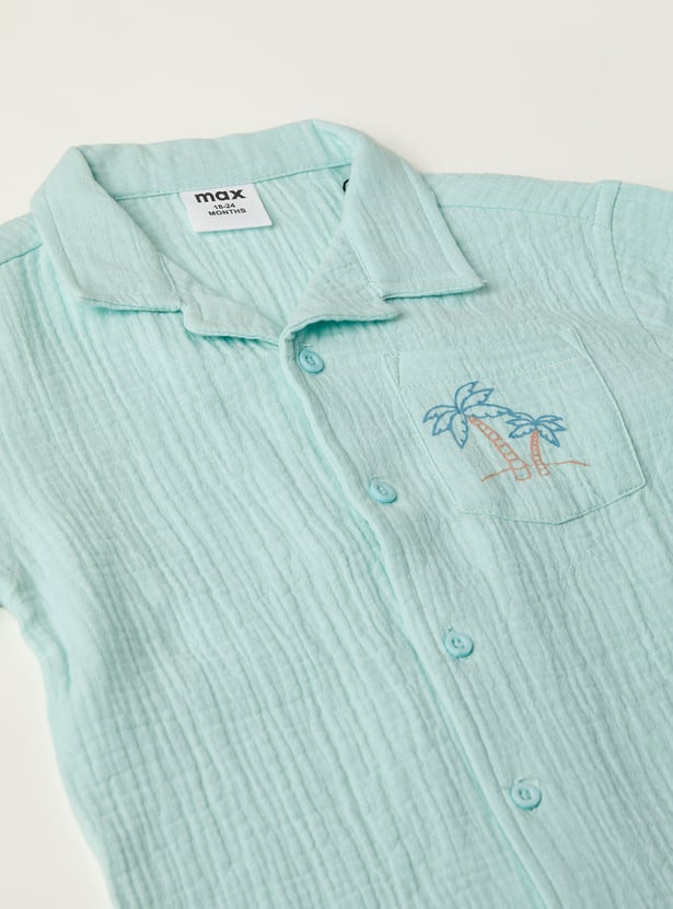 Summer days call for this comfy shirt featuring a textured design and a tropical print on the chest pocket. It is designed with a Cuban collar, half sleeves, and an even slit hem.