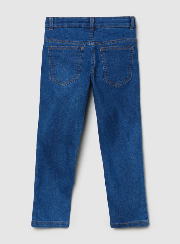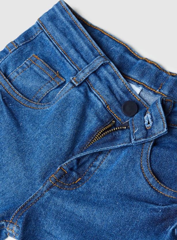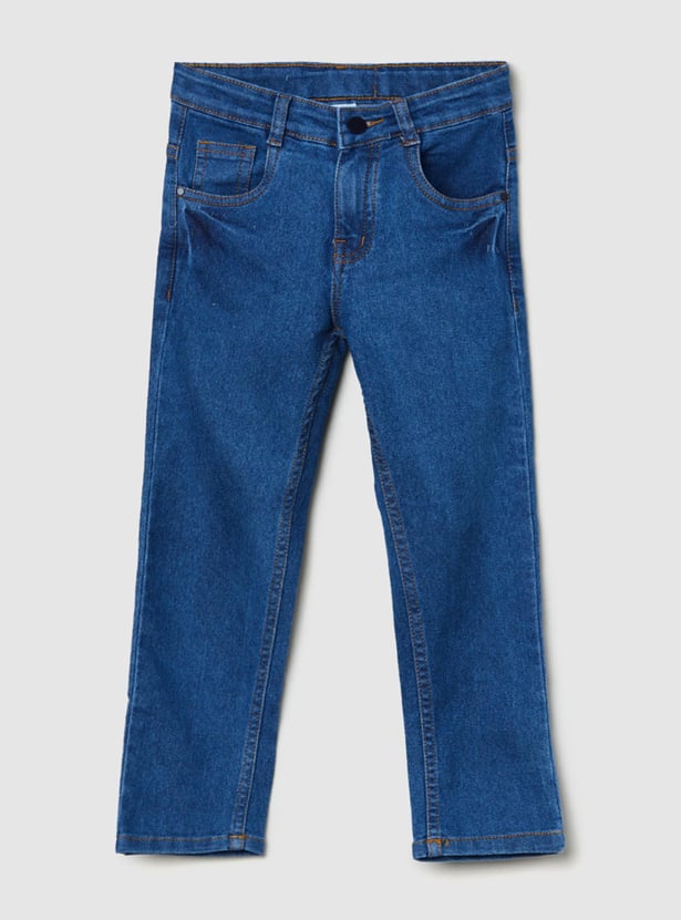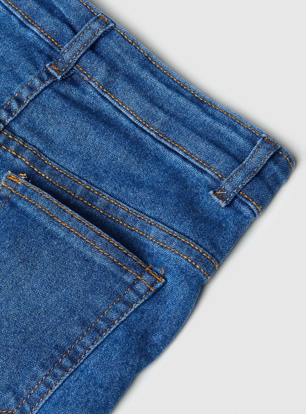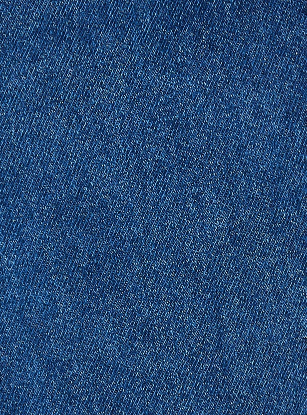 This pair of jeans are designed with a solid surface, button closure, insert, and patch pockets.