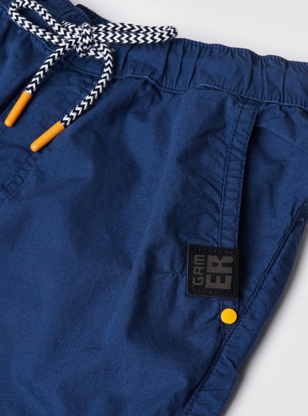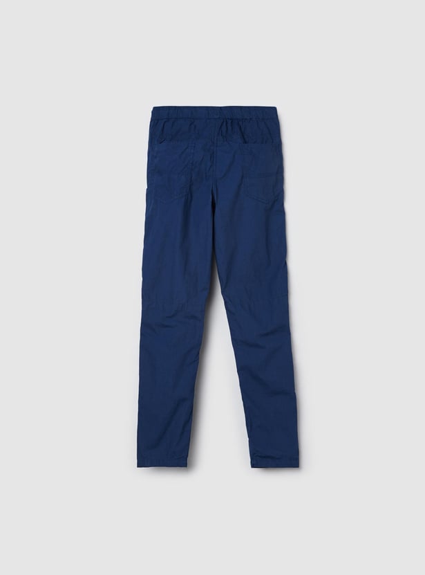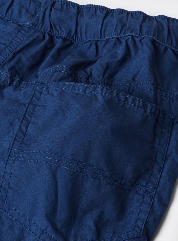 A pair of solid trousers designed with an elasticated waistband, slip-on closure, 2 pockets and mock fly.