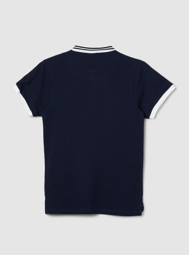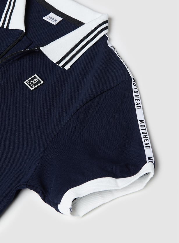 Make your young one's day a striped adventure in this casual polo T-shirt which features shoulder tape detail on a solid surface with a contrast polo collar with zipper closure and short sleeves. Grab these soft comfort wear letting the stripes and smiles begin.