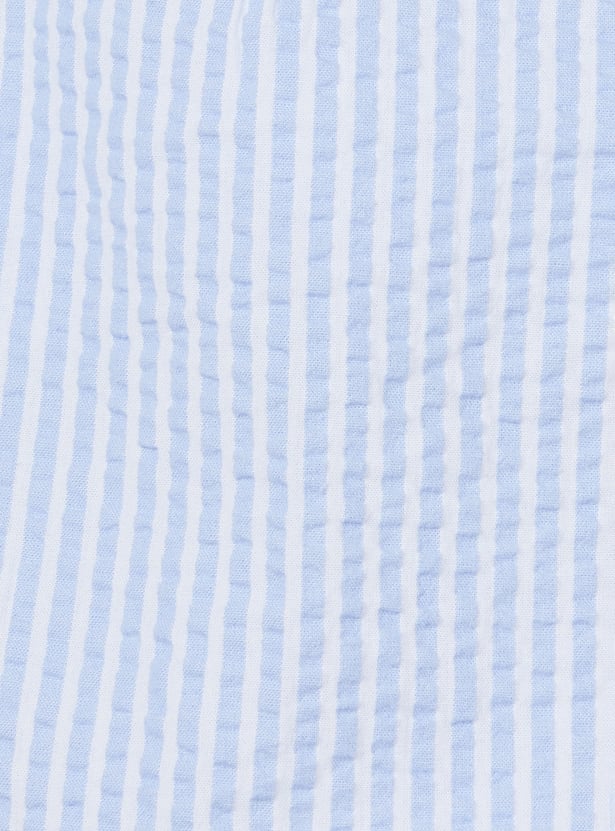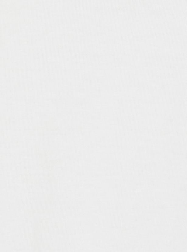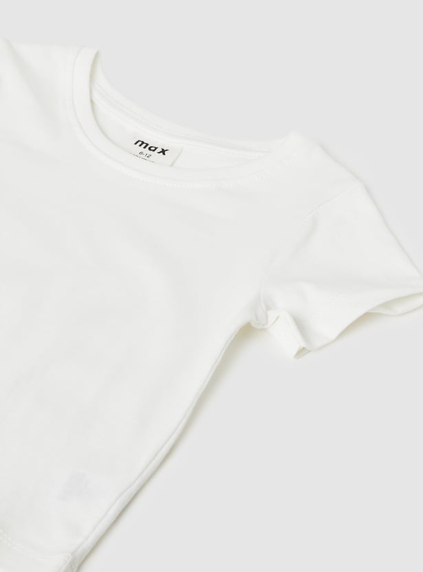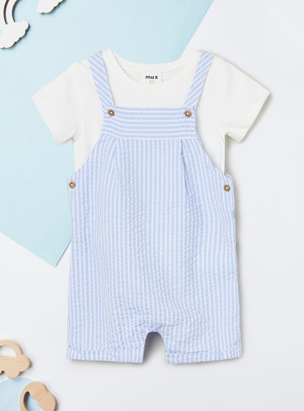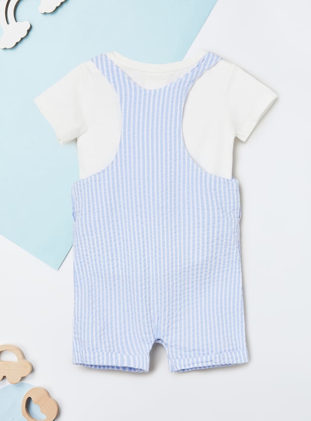 This cute combo features a striped dungaree with shoulder straps and button closures, paired with a comfy printed T-shirt with a crew neck and half sleeves.