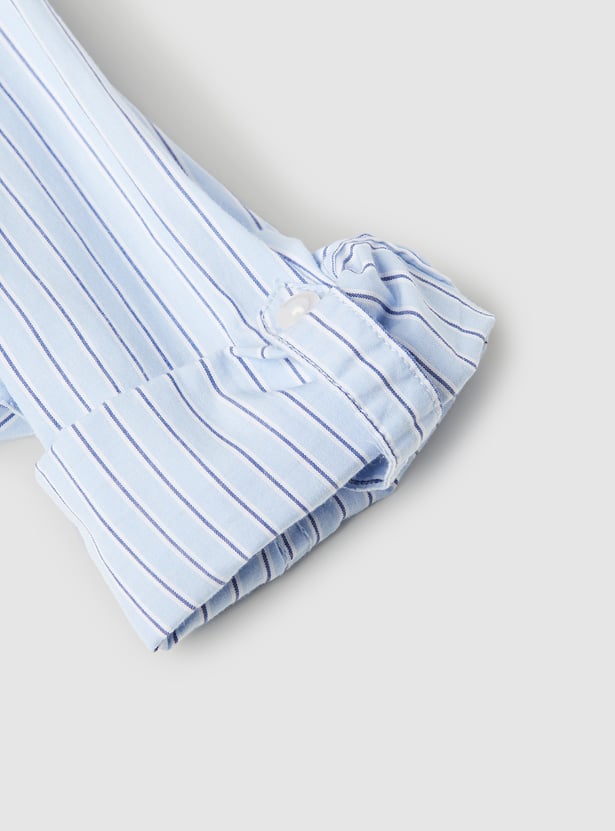 Give his wardrobe a smart upgrade with this striped shirt, featuring a spread collar and full sleeves with cuffs for a polished look. Designed with a patch pocket for added detail and a back print for a trendy touch, this shirt is finished with a button placket for easy wear.
