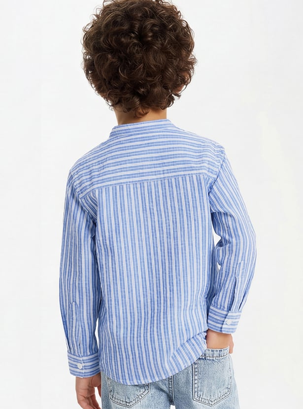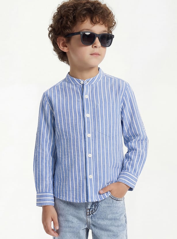Refresh your everyday wardrobe with this striped shirt designed for versatile style. Featuring a band collar, full sleeves, button placket, patch pocket, and a curved hem for a clean finish.