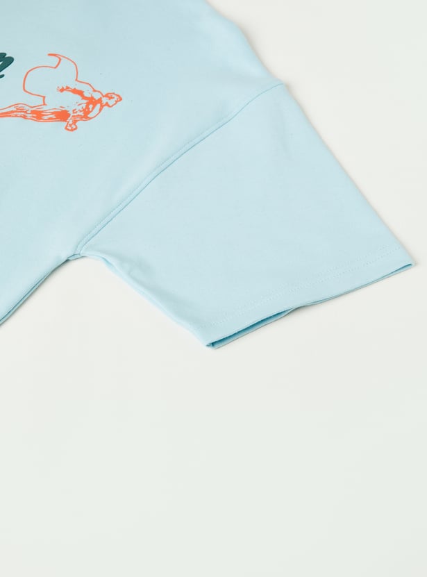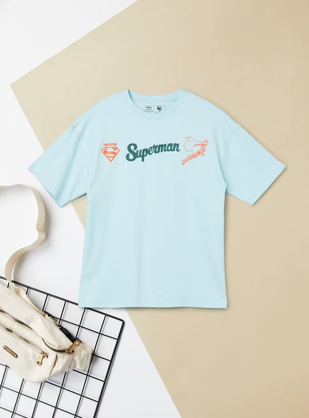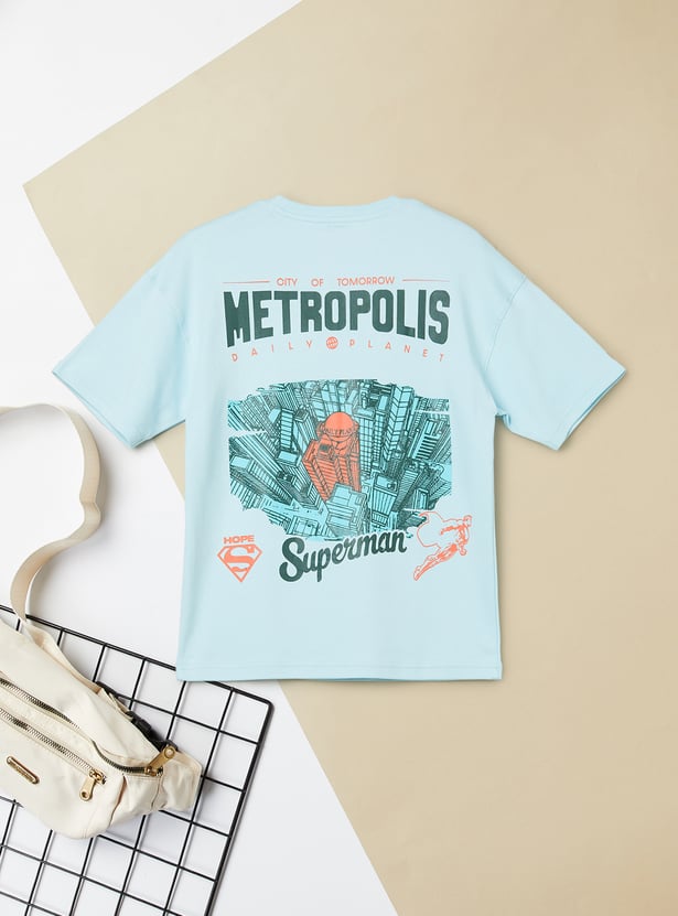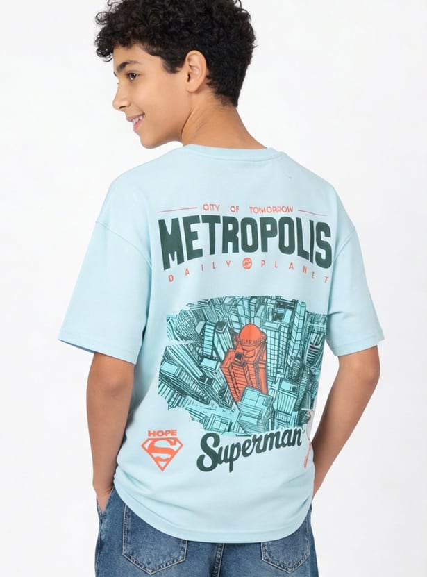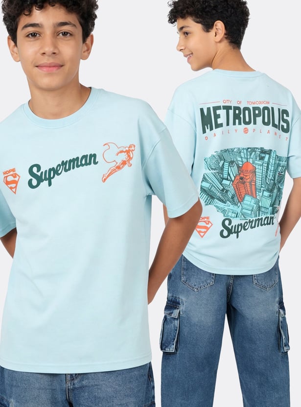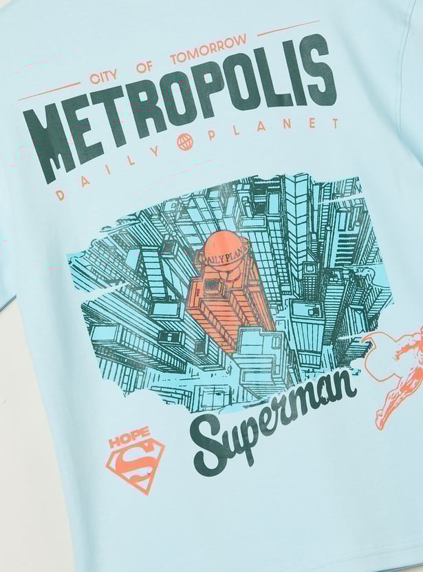 Add a heroic touch to his everyday style with this T-shirt. Designed with a classic crew neck and half sleeves, it features a Superman print on the chest and a bold graphic at the back for a standout look.