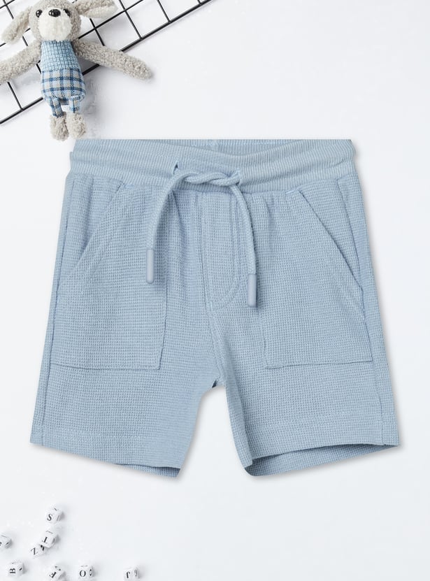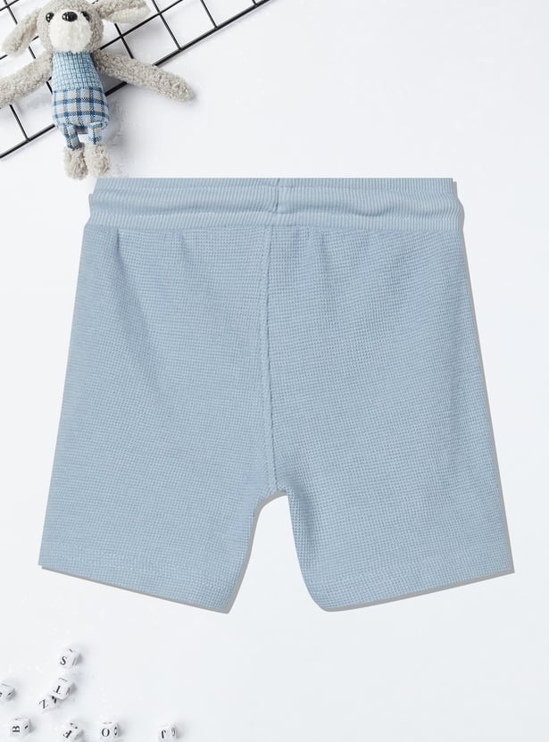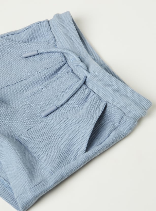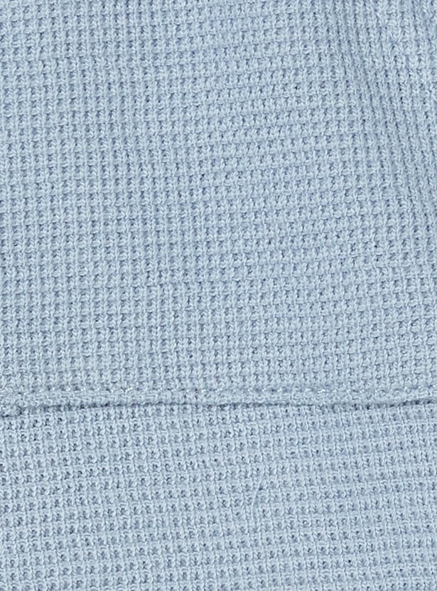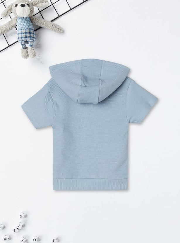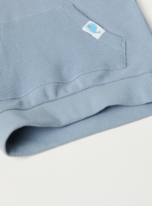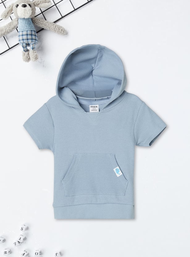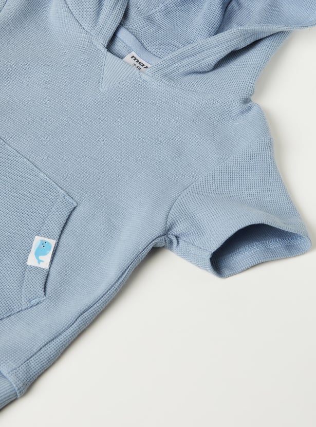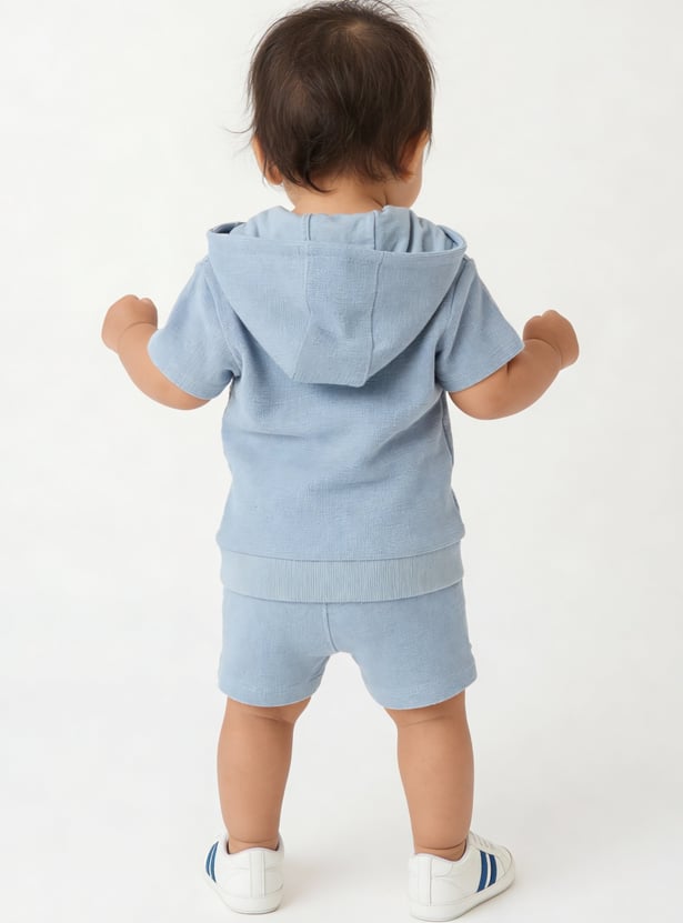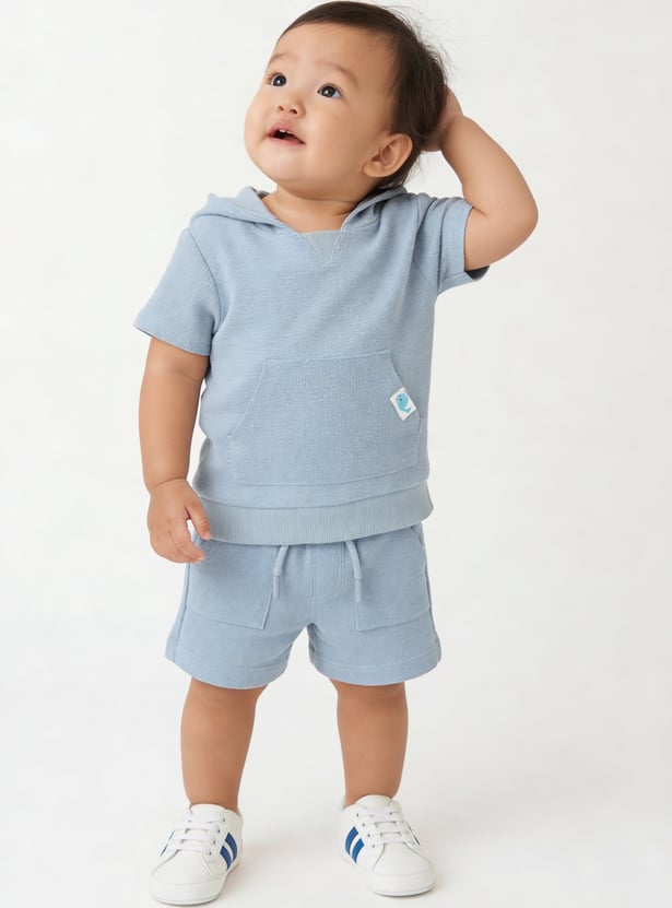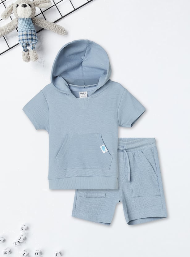 Step into casual comfort with this textured shorts set, featuring a hooded neck T-shirt with half sleeves and a handy kangaroo pocket. Paired with shorts designed with a drawstring closure and functional pockets, it’s the perfect mix of style and utility.