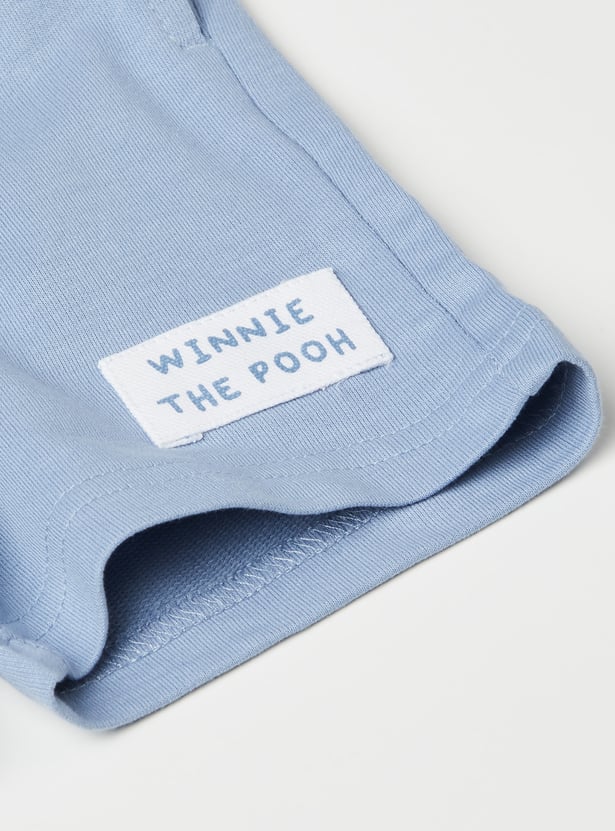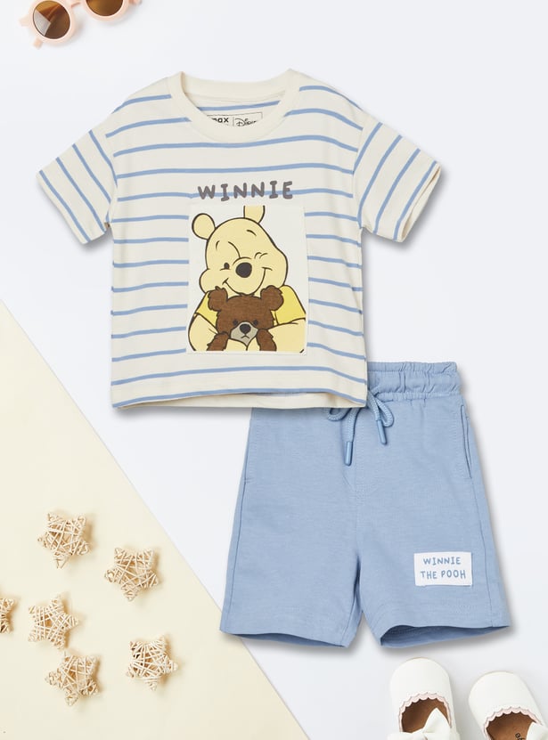 Keep playtime cozy with this Winnie The Pooh shorts set, featuring a round-neck T-shirt with half sleeves and matching shorts with a drawstring closure and pockets.