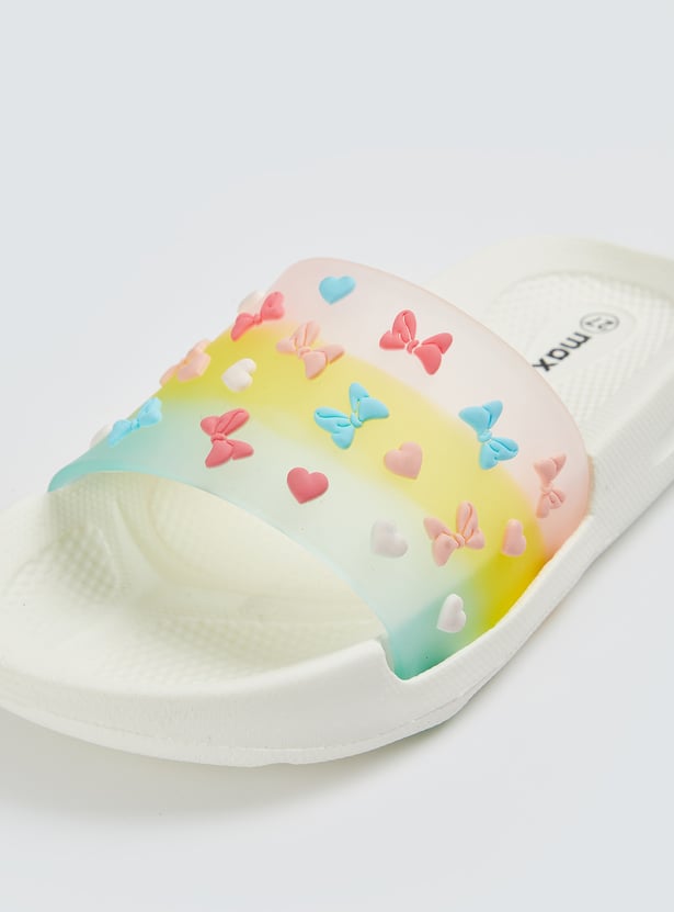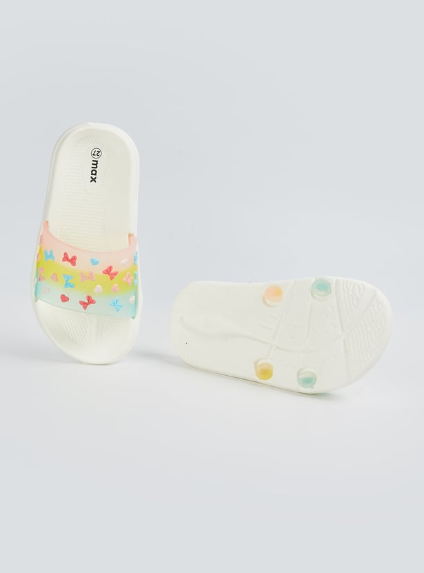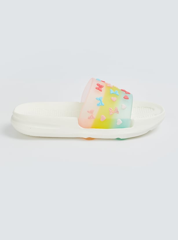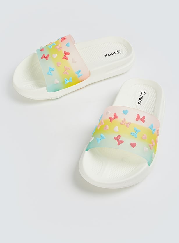Let your kid stay comfortably stylish with these butterfly‑themed sliders, designed with a one‑band upper featuring a playful 3D pattern, open toe, and contoured footbed—perfect for poolside lounging or casual outings.