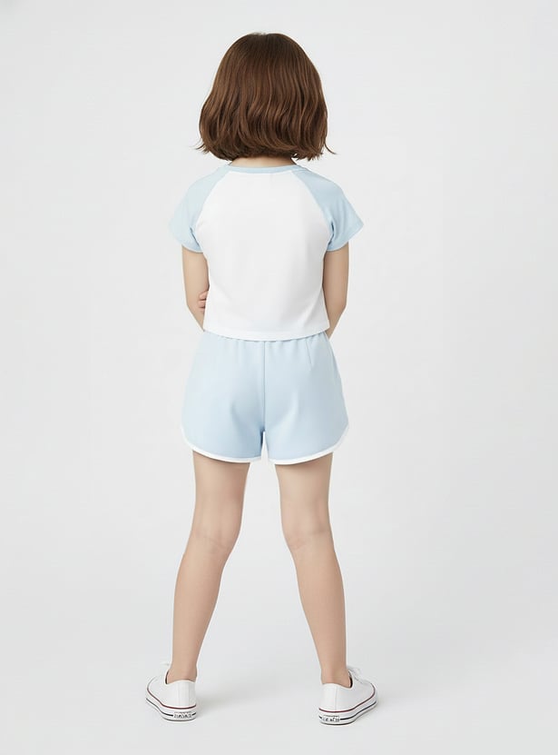 This colourblock shorts set features a trendy t-shirt with a round neck and half sleeves, paired with printed shorts that include taping details and a drawstring closure. A perfect blend of style and comfort for casual, laid-back days.