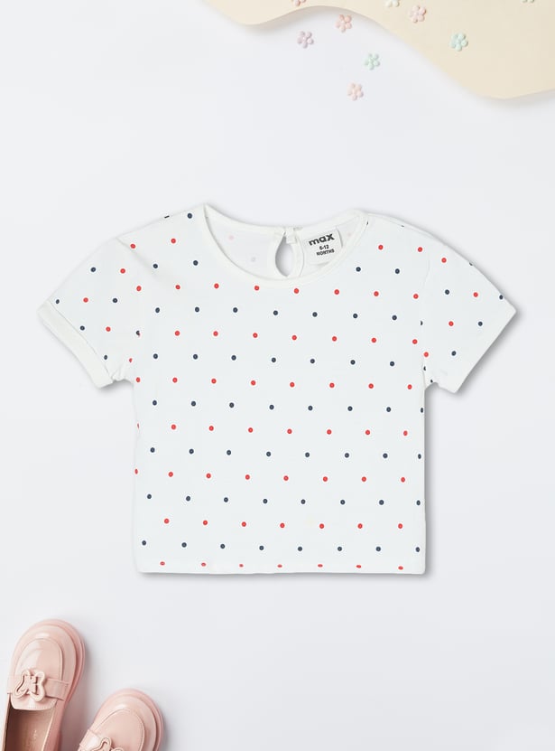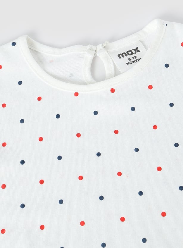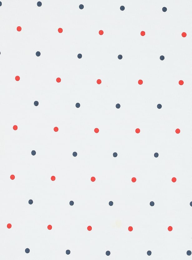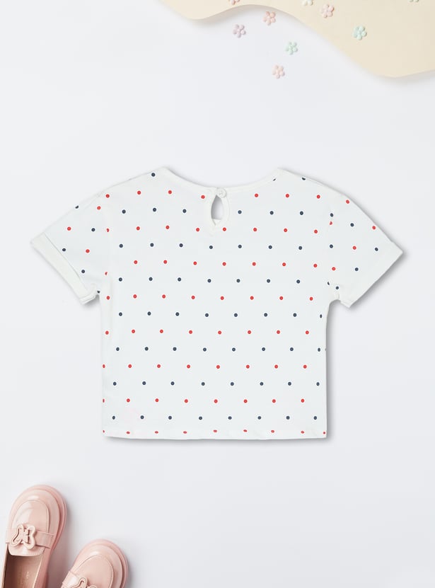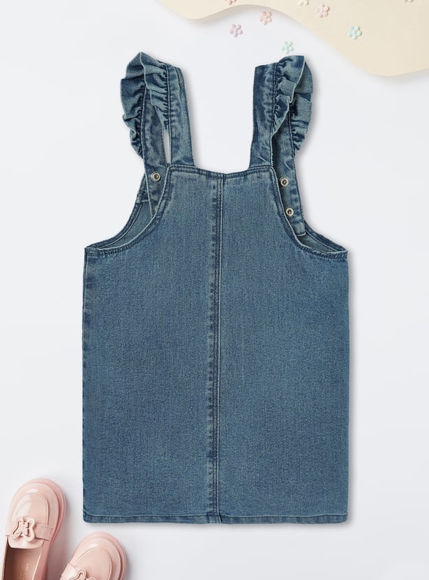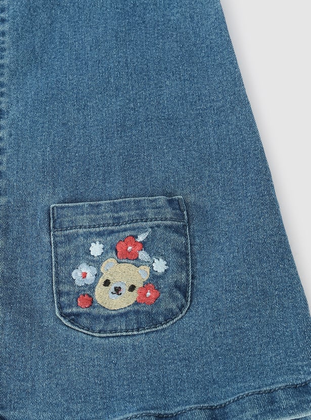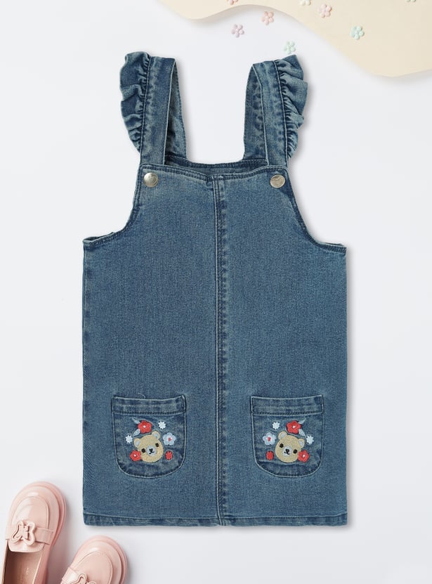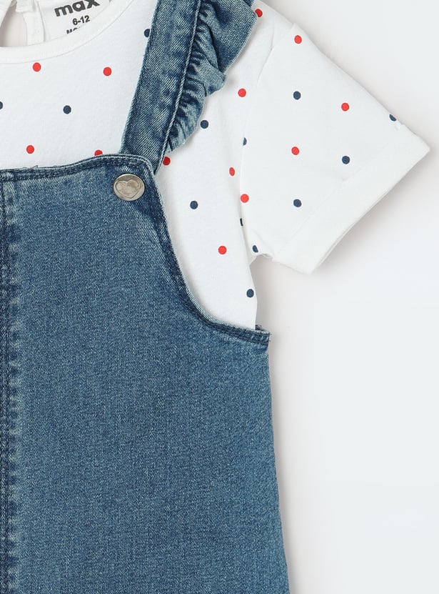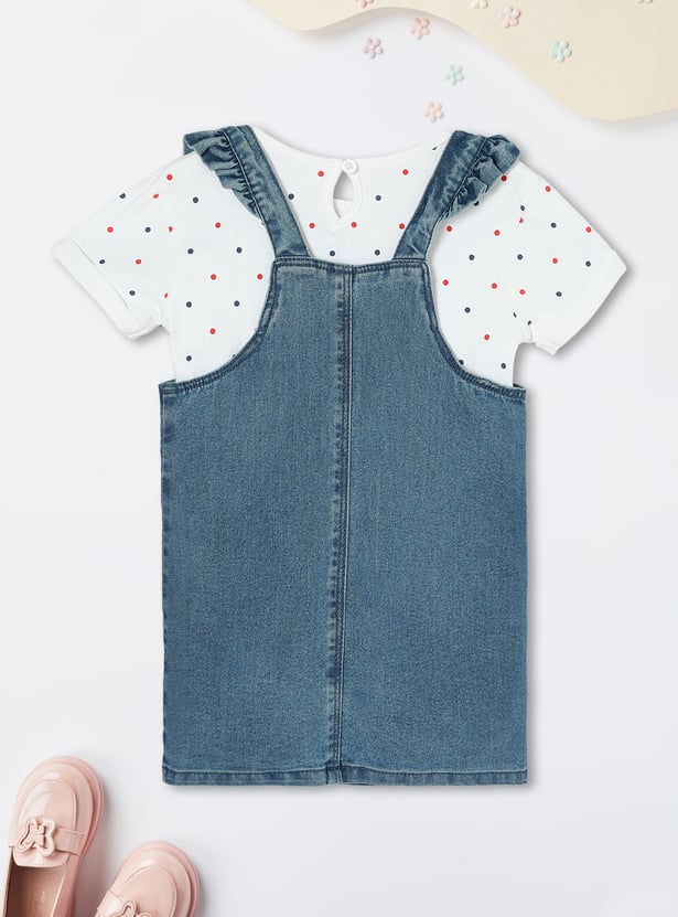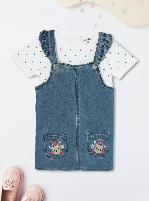 Upgrade her wardrobe with this adorable denim pinafore dress. Featuring frilled straps, embroidered pockets, and a straight hem, it adds a stylish flair to her look. Paired with a cute polka dot printed T-shirt, this set is perfect for a playful and trendy ensemble.