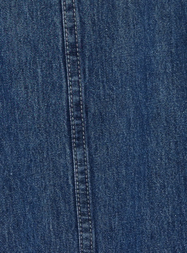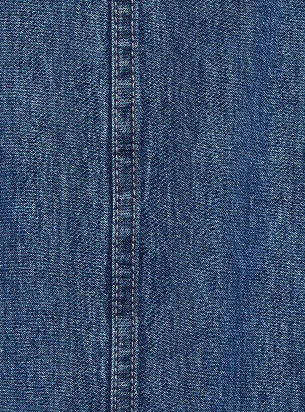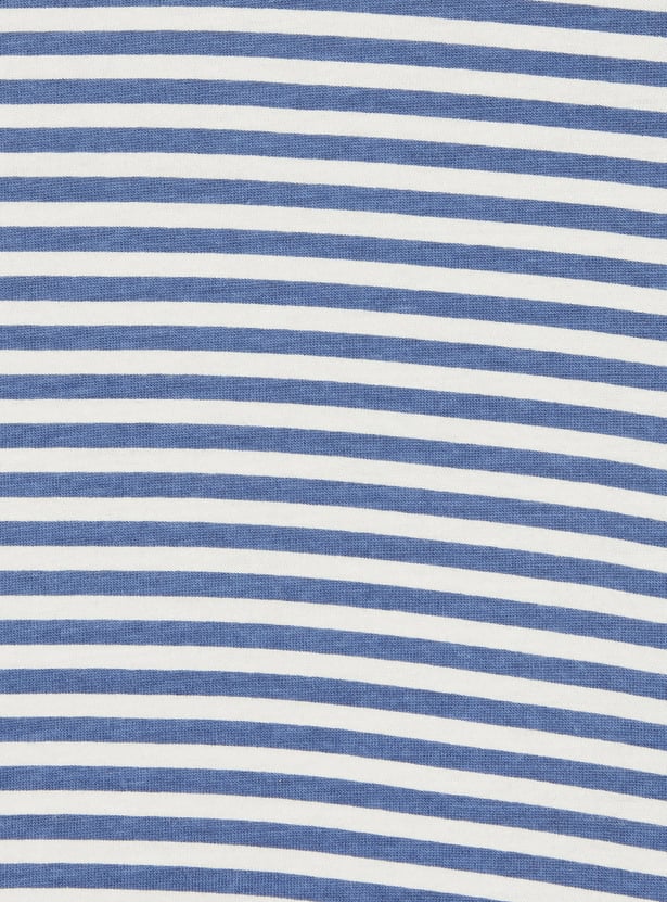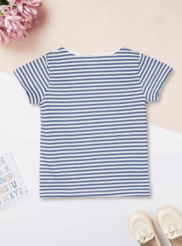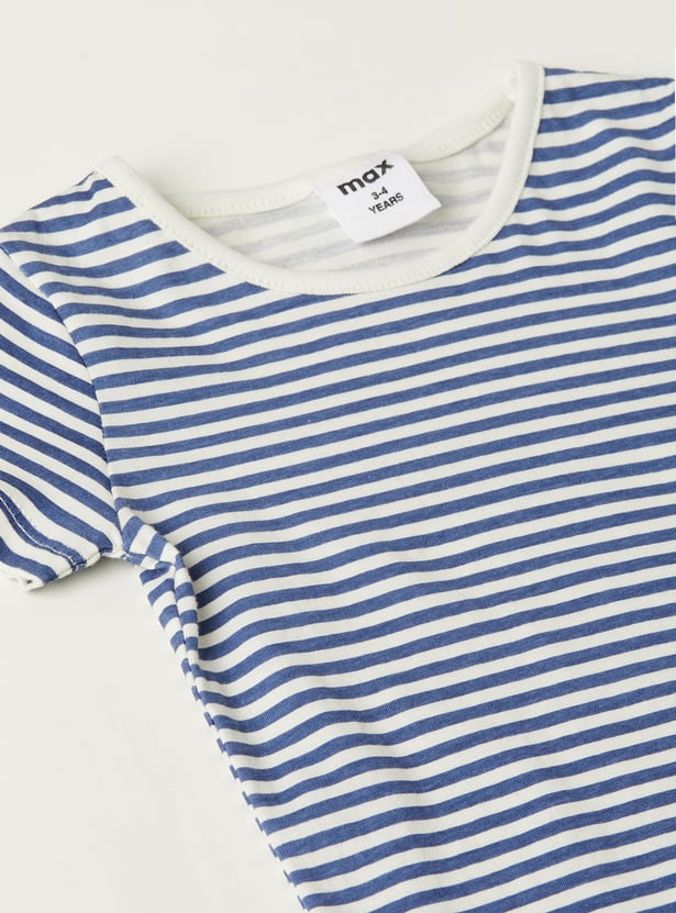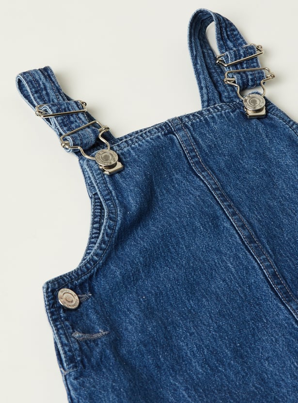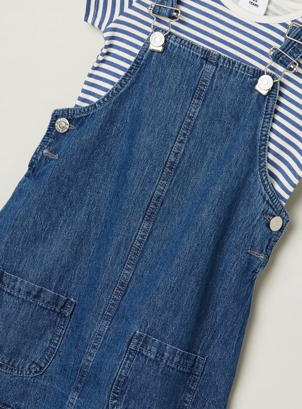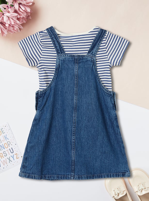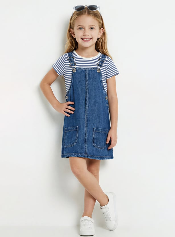 This denim pinafore dress features a solid finish, a square neckline, and two front pockets, paired with a striped T-shirt. The inner tee comes with a round neck and half sleeves, creating an easy, layered look.