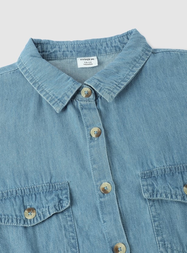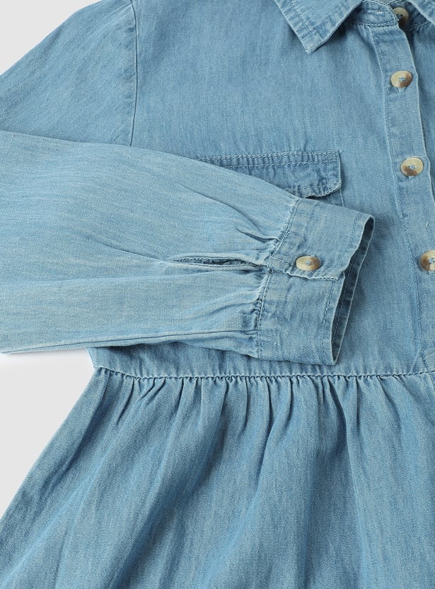 This denim shirt dress for your little one features flap pockets, full sleeves with flared hems, and a button placket, all crafted in a tiered silhouette for a chic and playful twist.