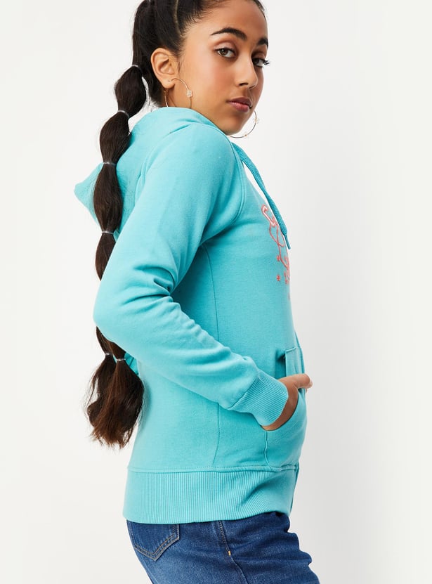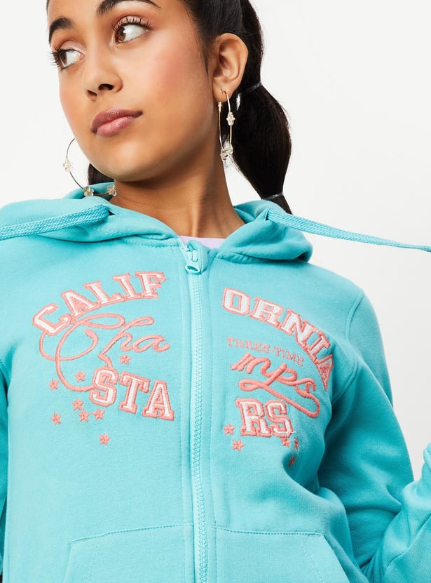 Cure her winter blues with this sweatshirt that is updated embroidery detailing at the front. It is fashioned with a hooded neck, long sleeves, zip front closure, a split kangaroo pocket, and ribbed trim.