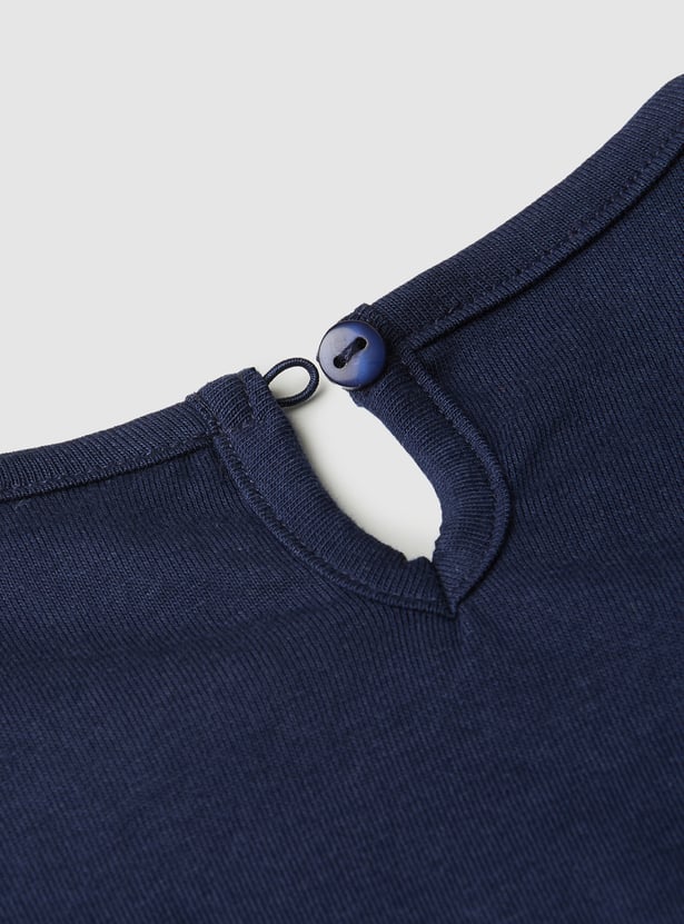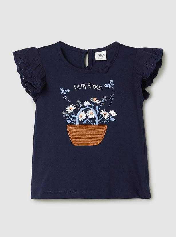 Pretty up her wardrobe with this top. It features a round neck, schiffli embroidered sleeves with a scalloped trim, and an embroidered chest.