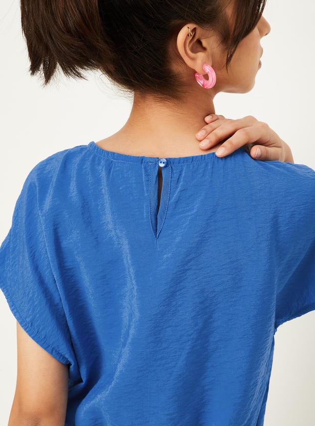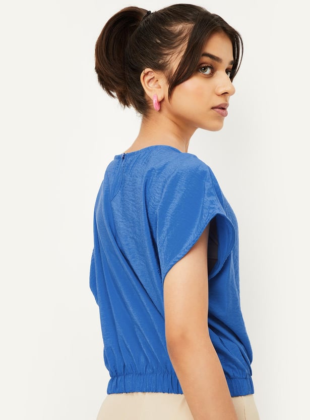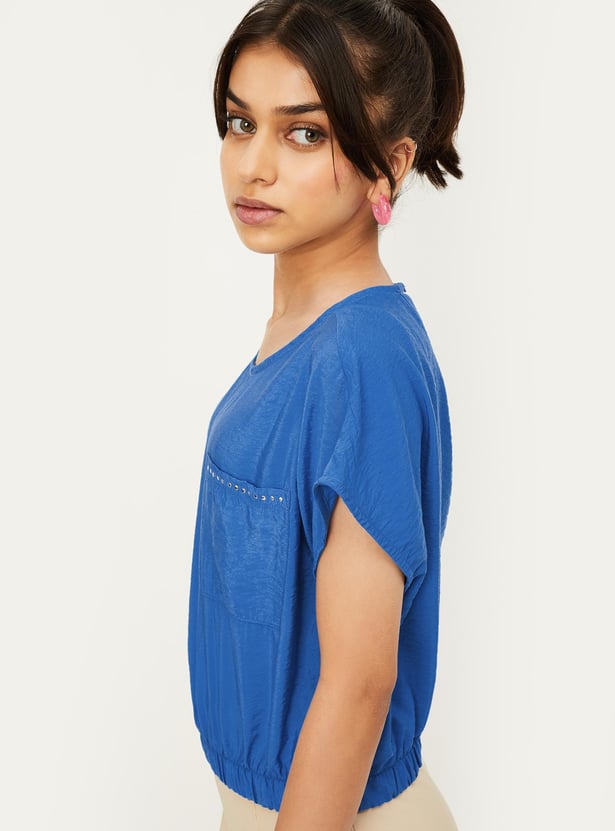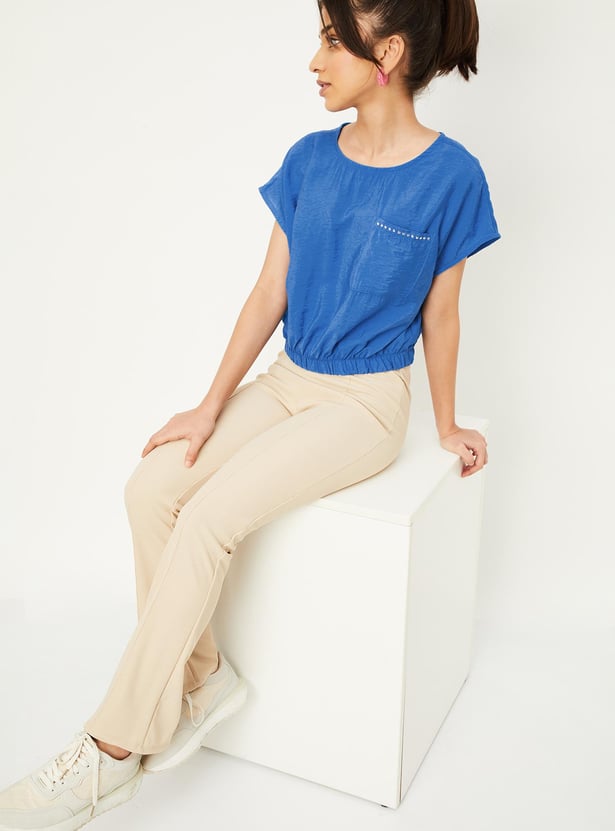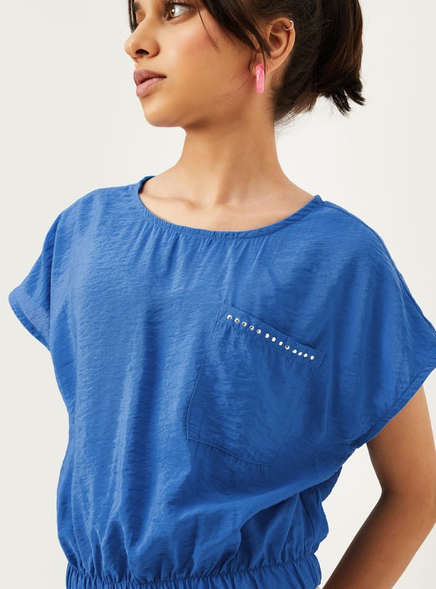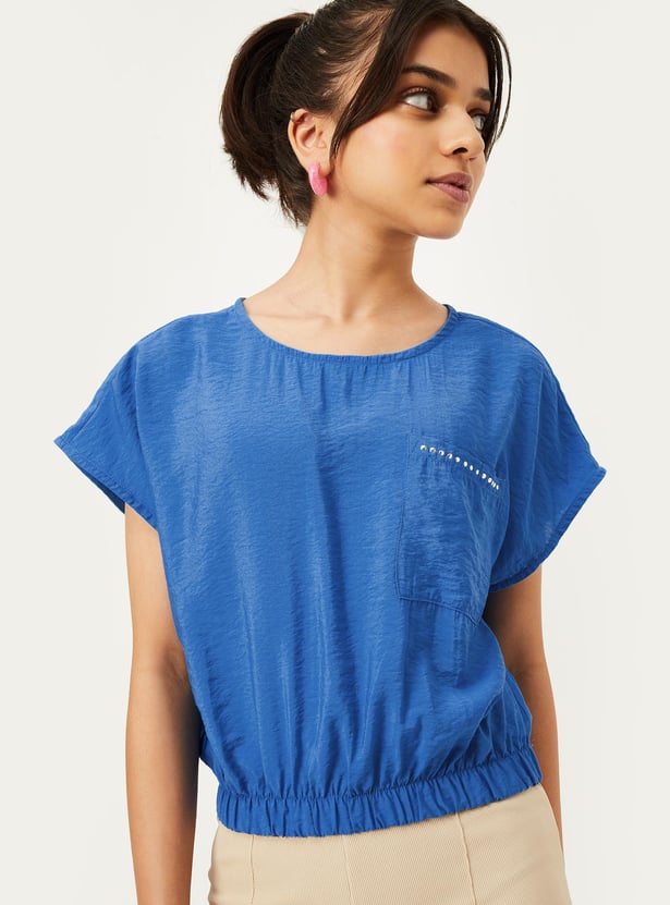 A perfect option for your little diva, this fashionable top has a textured finish and an embellished detail on the chest pocket. This crop profile has a round neck, extended sleeves, and an elasticated hem.