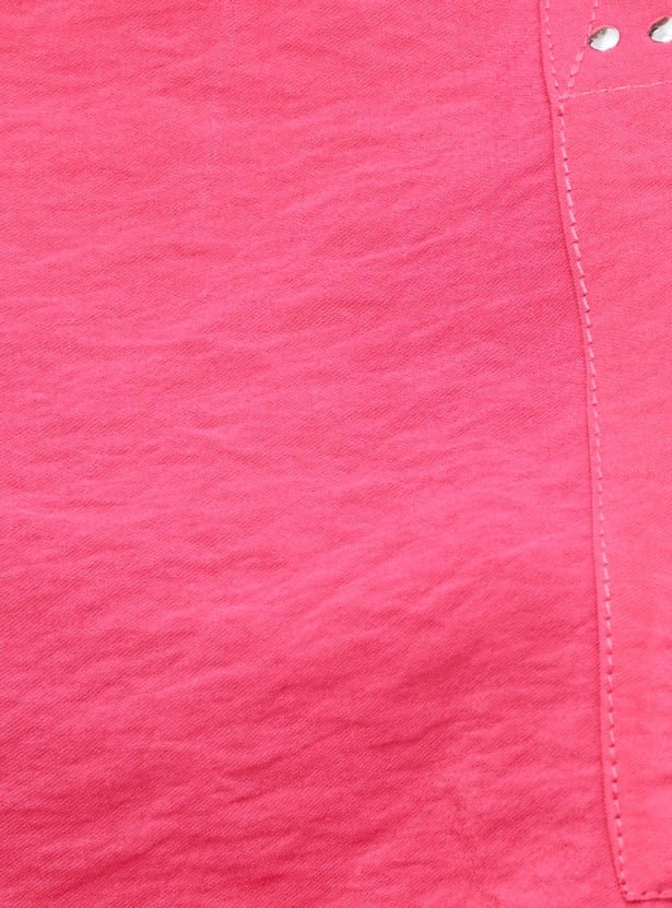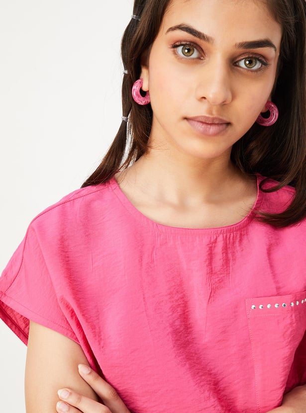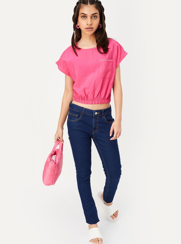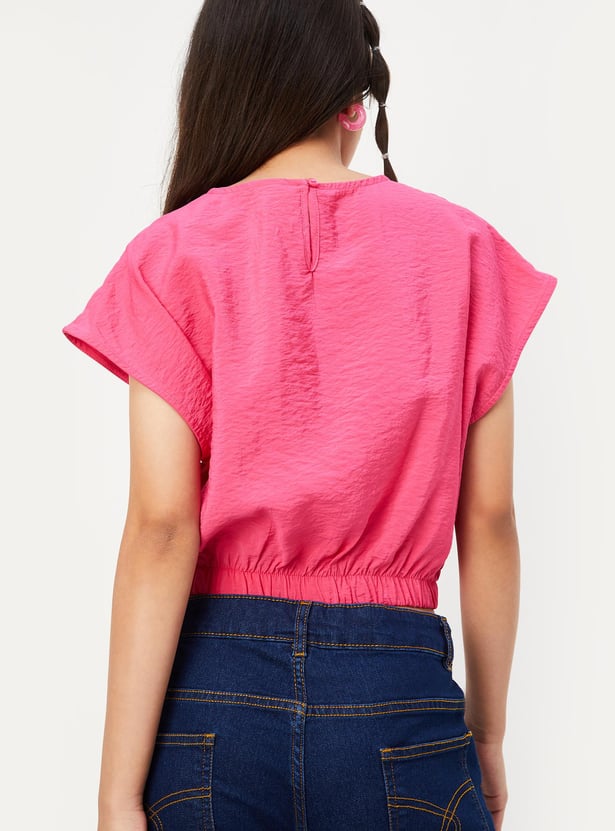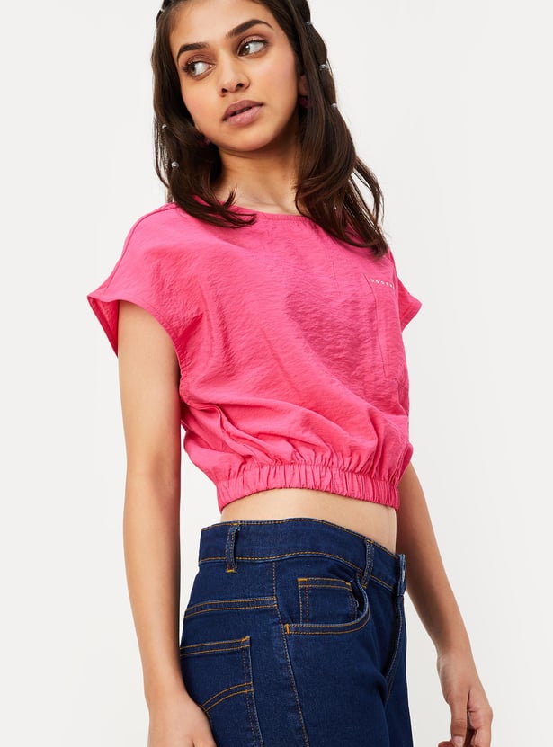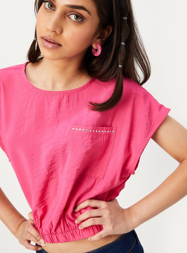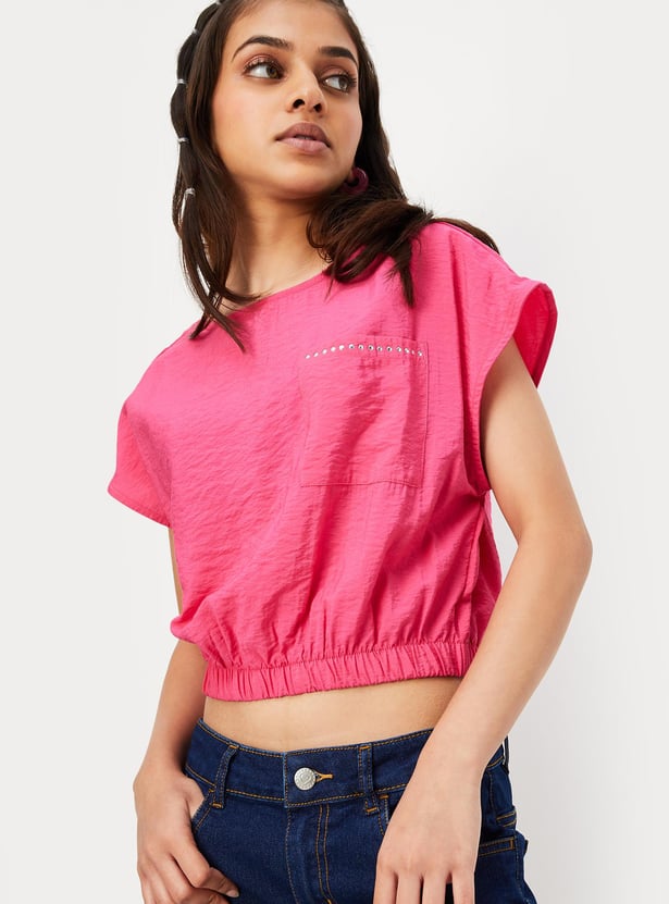 A perfect option for your little diva, this fashionable top has a textured finish and an embellished detail on the chest pocket. This crop profile has a round neck, extended sleeves, and an elasticated hem.