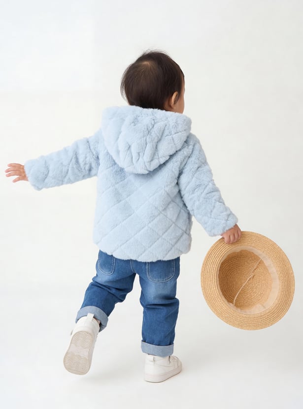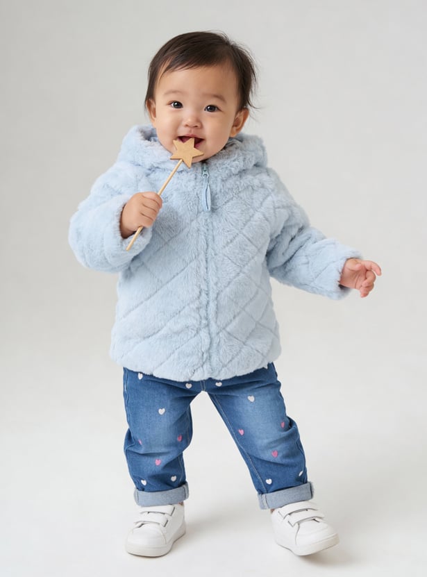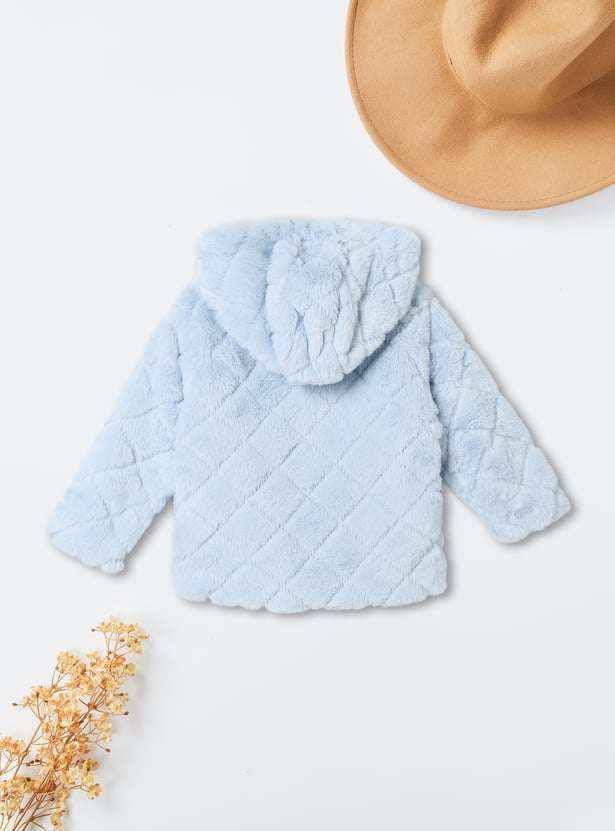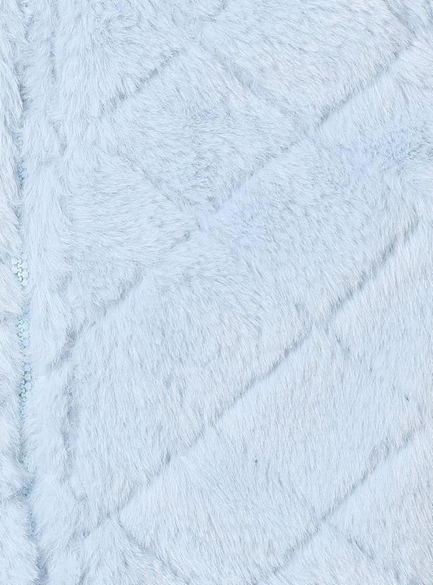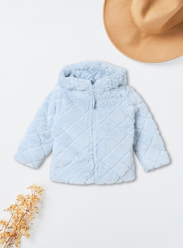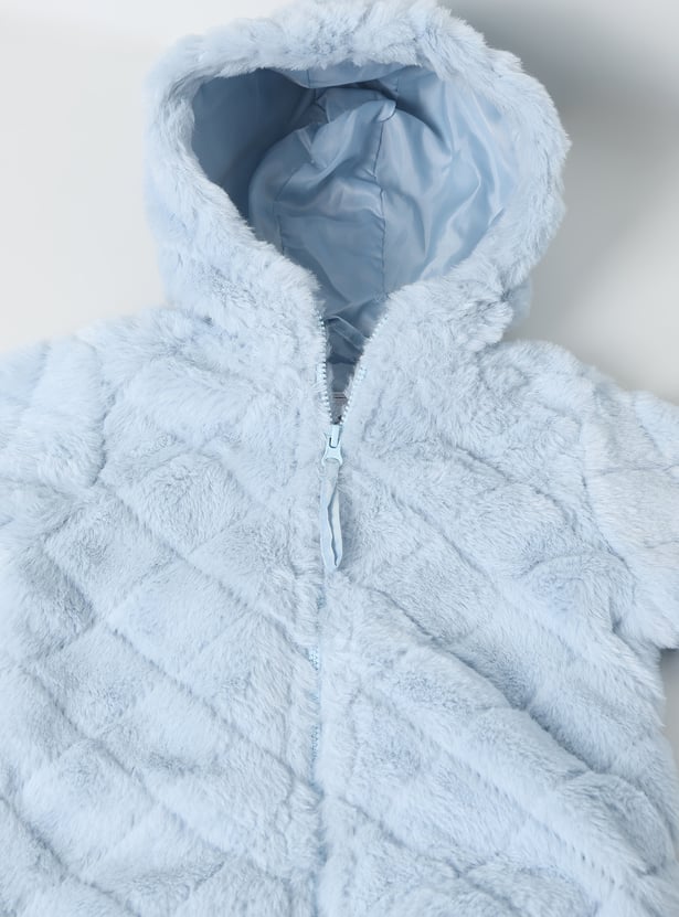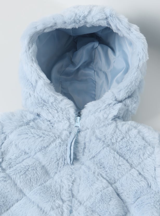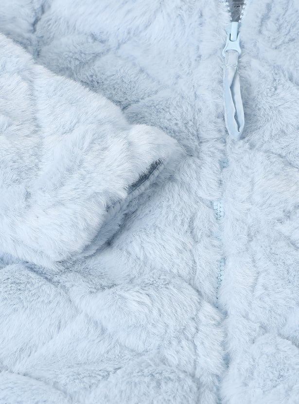 Stay snug and stylish with this fuzzy hooded jacket featuring a zip closure and full sleeves for added warmth.