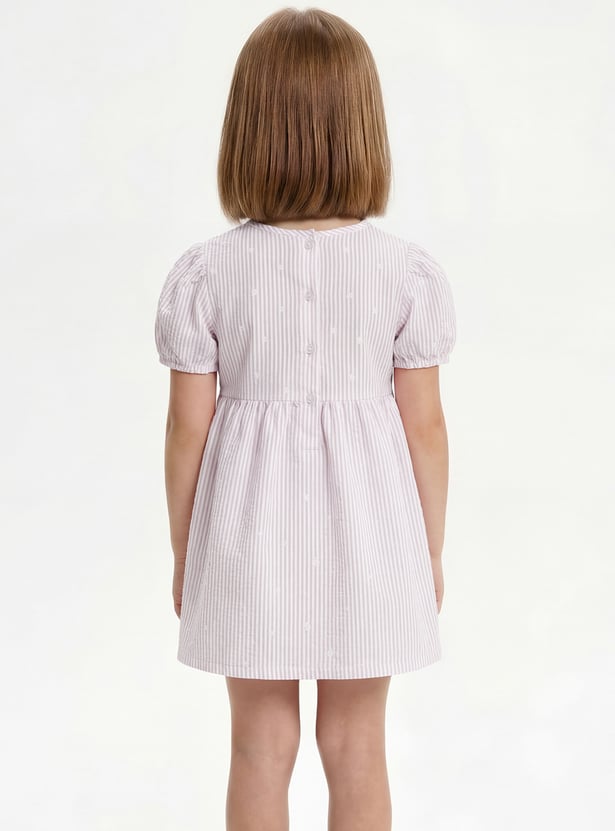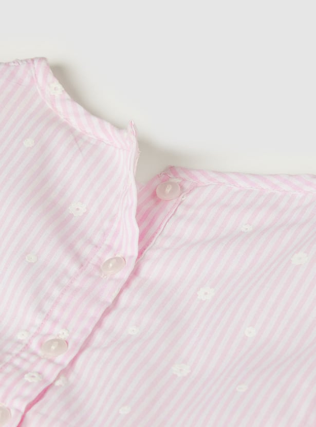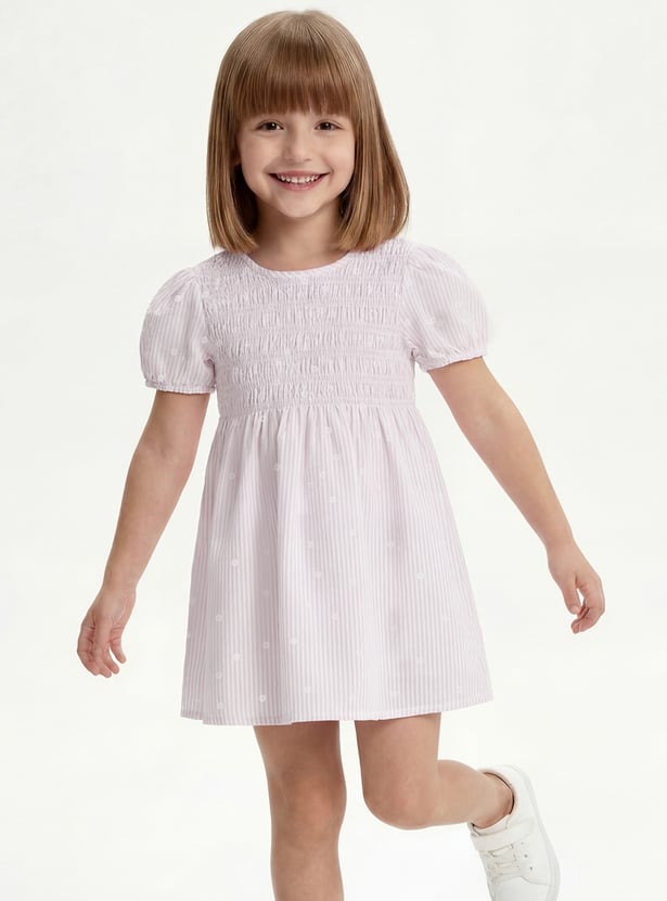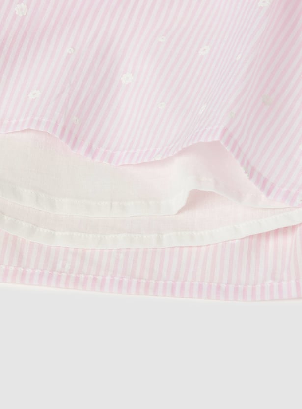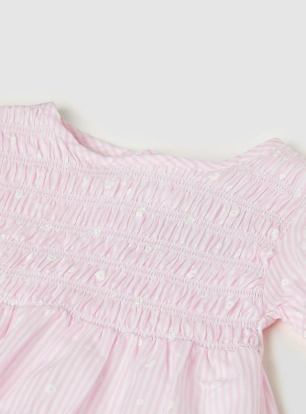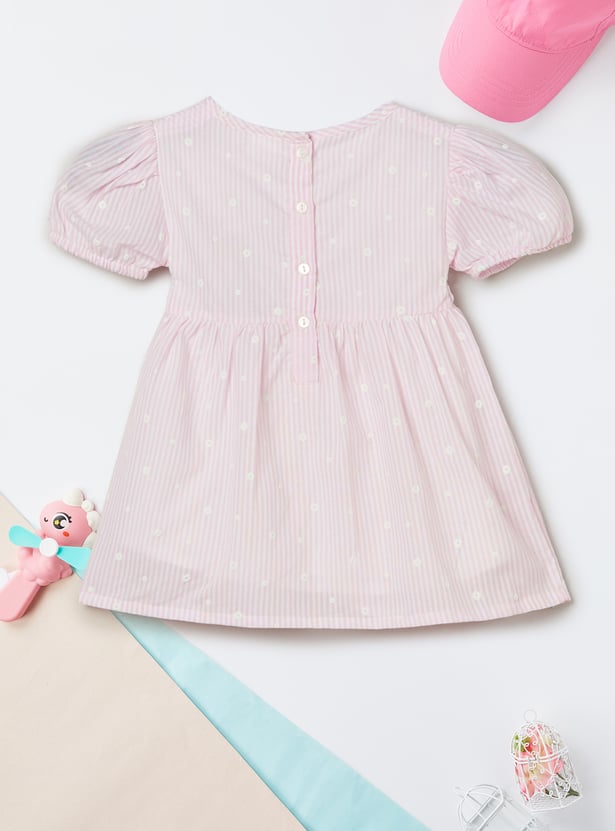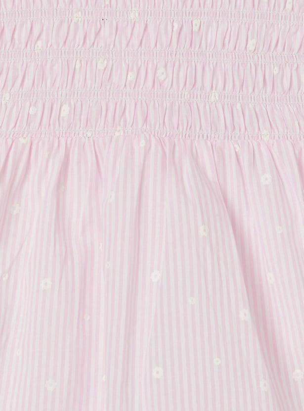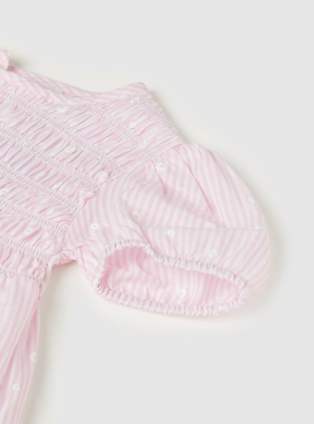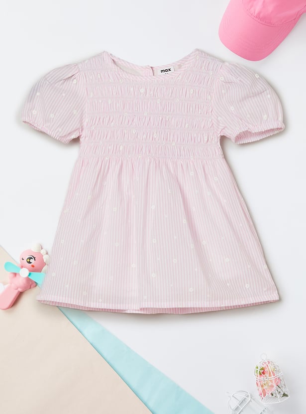 Add a charming touch to her everyday wardrobe with this top. Designed in an A-line silhouette with a round neck and puffed sleeves, it features classic gingham checks for a timeless look. It is finished with delicate floral detailing for an extra sweet detail.