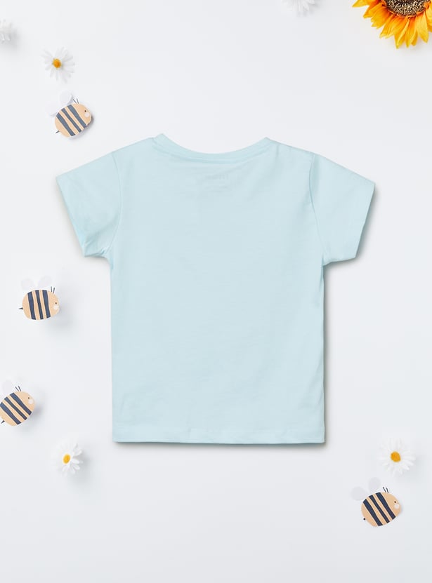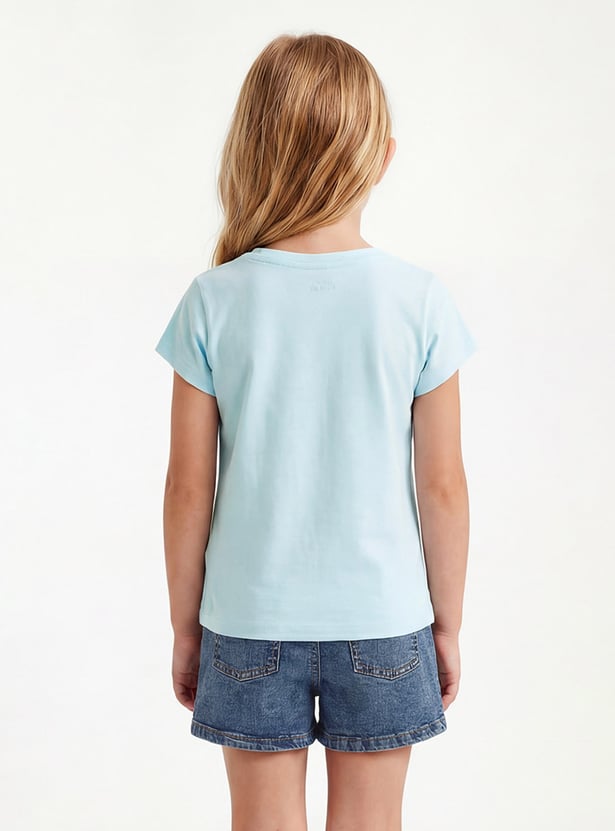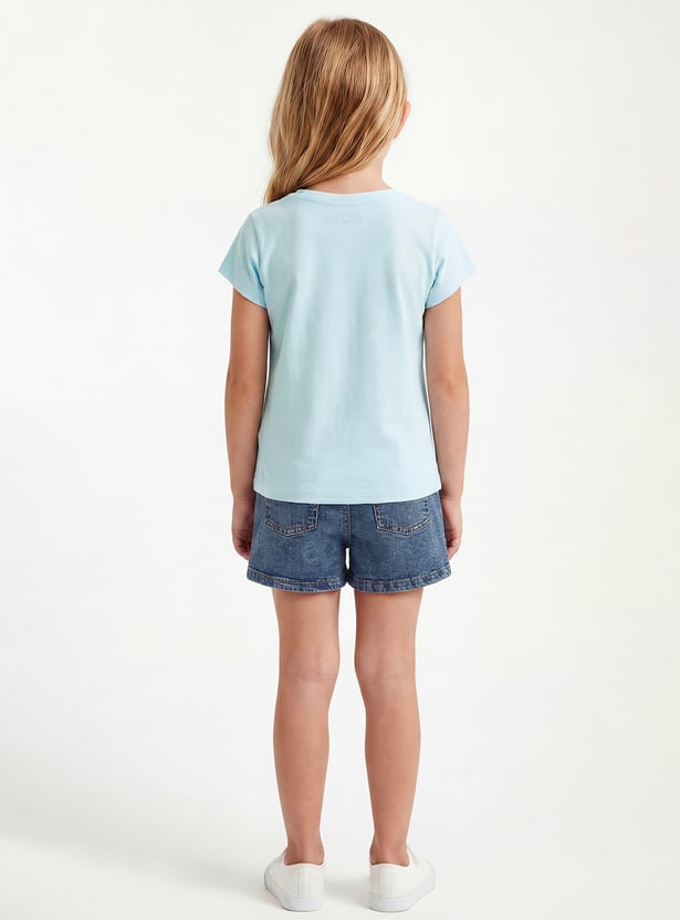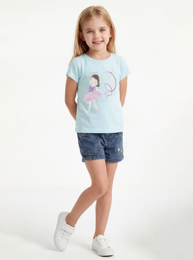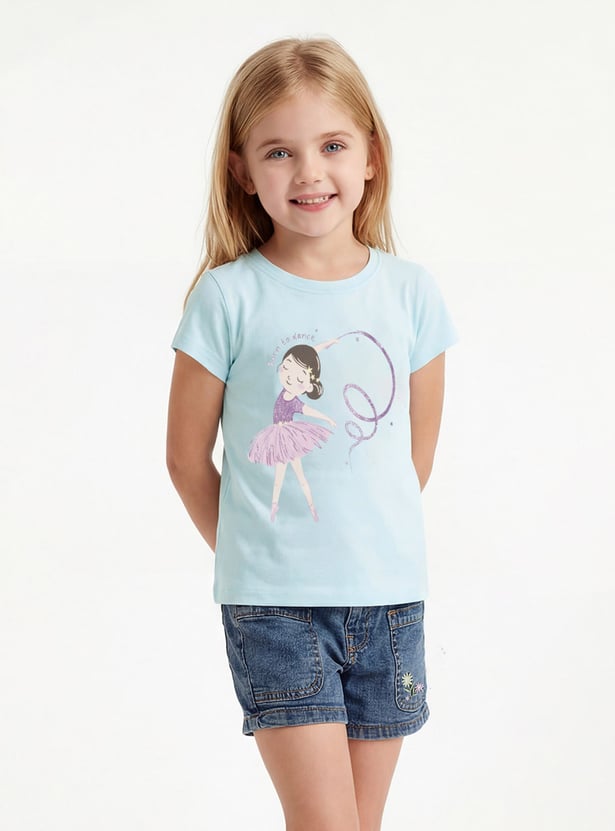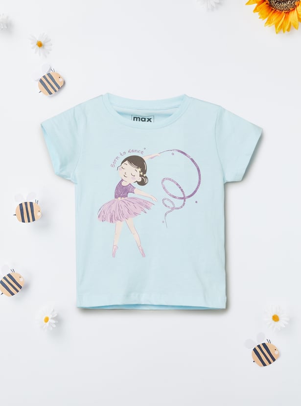 Add a touch of sparkle to her style with this T-shirt. It features a ballerina print at the front enhanced with glitter accents for a subtle shine. Designed with a classic round neck and comfortable half sleeves, it offers an easy fit for all-day wear.