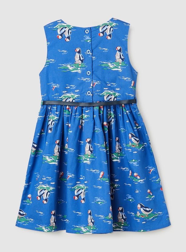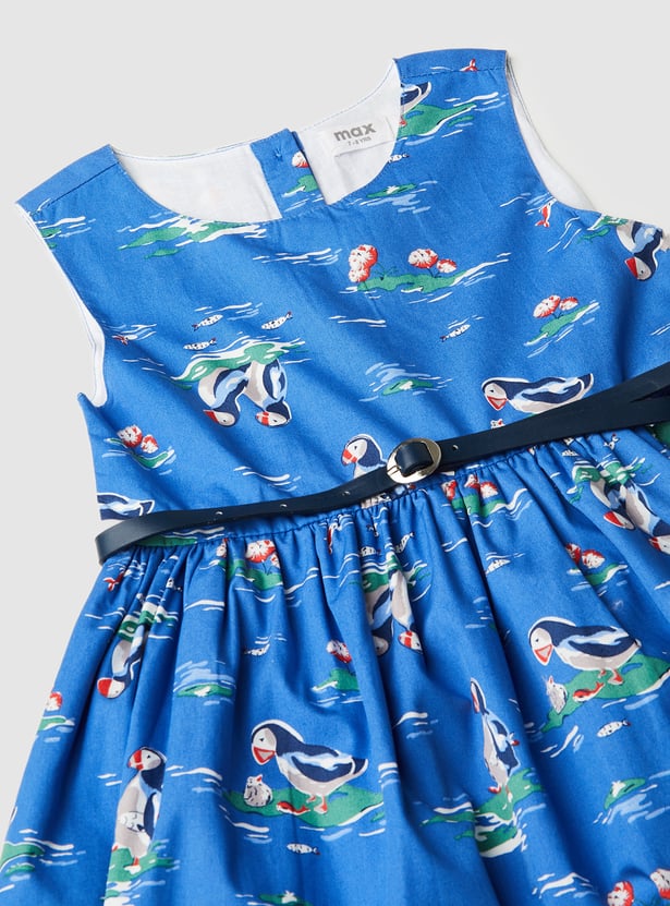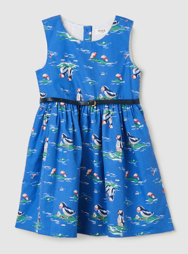 Your kid will have a happier day wearing this printed fit and flare dress. It has a belt, a round neckline, a sleeveless profile and a button closure.