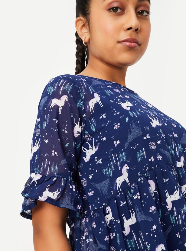 Refresh her summer wardrobe with this top that is updated with prints. It features a round neck, half sleeves, button closure, a peplum hem with gathered detailing, and a flared profile.