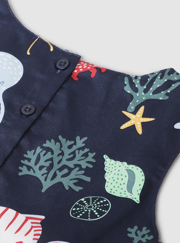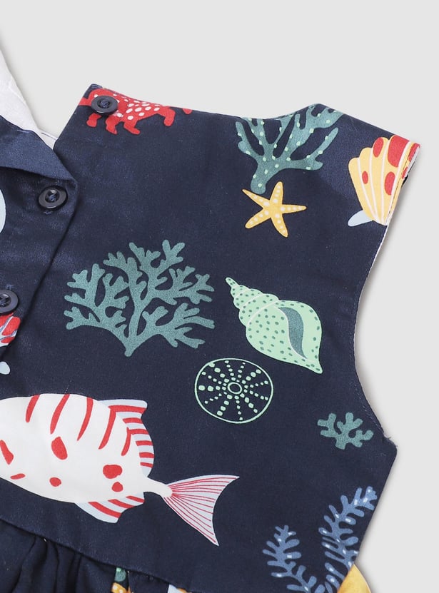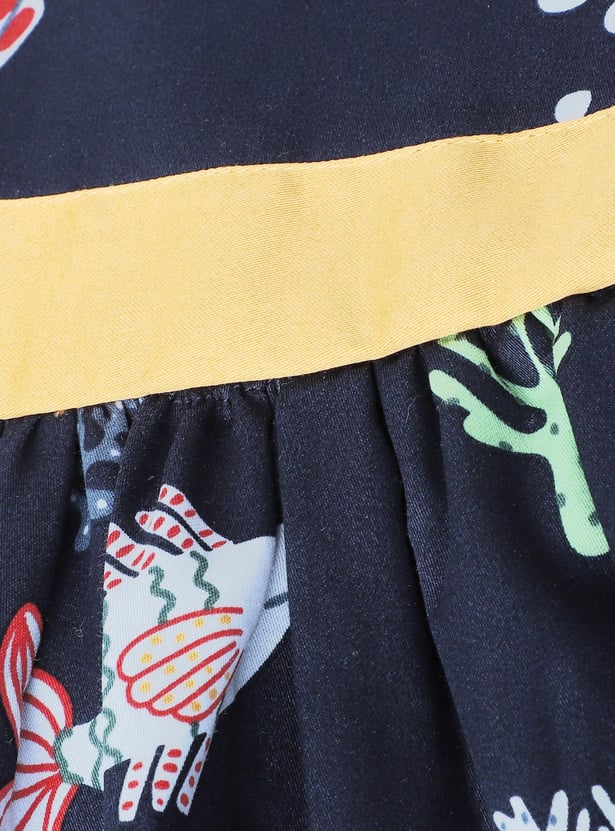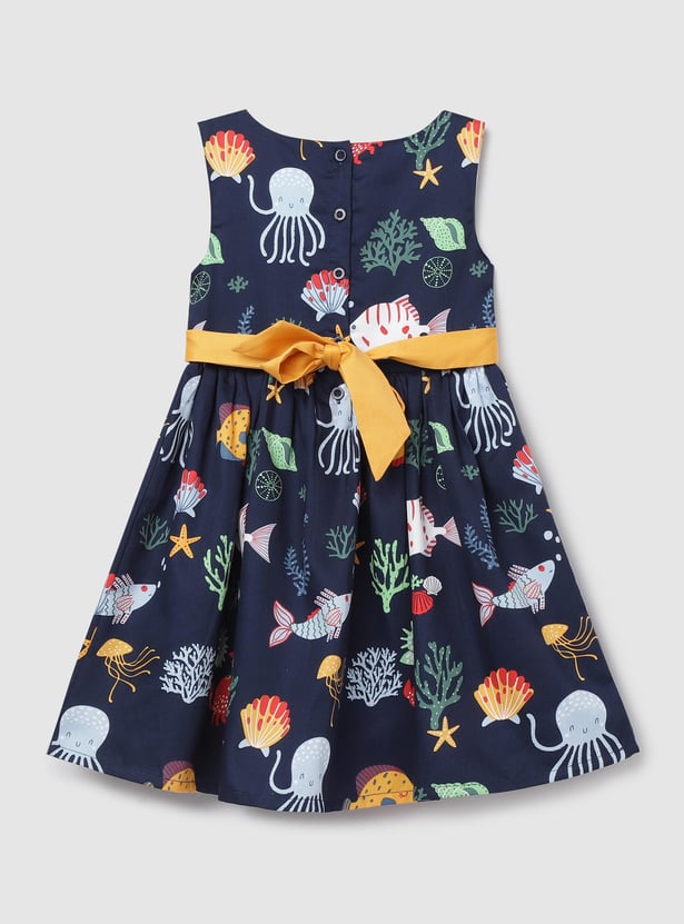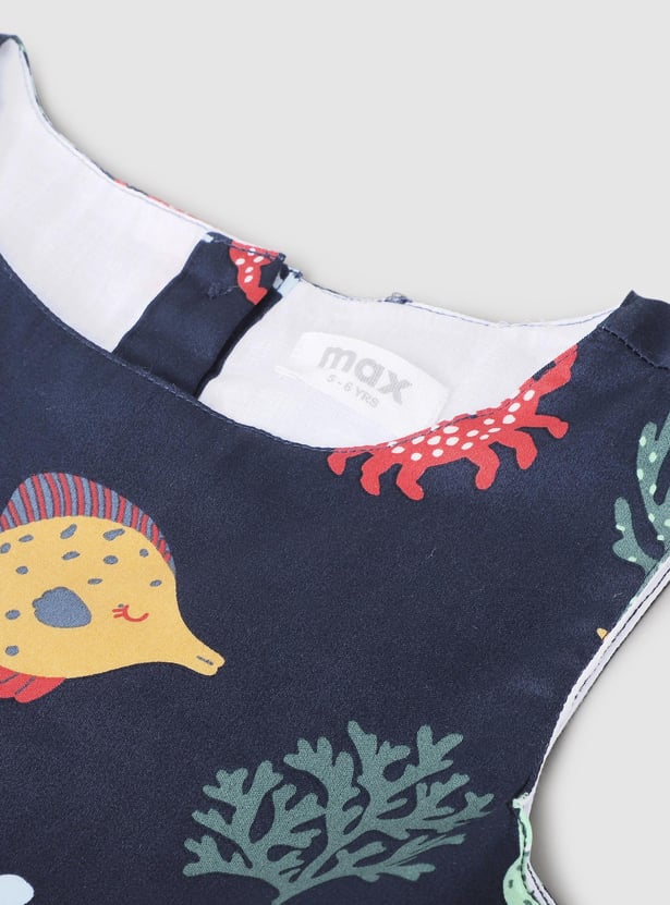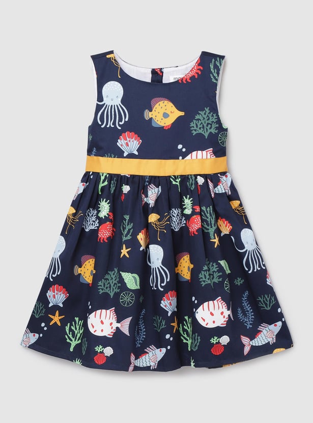 Designed with printed detail, this dress comes with a round neck, a sleeveless look and an A-line silhouette to complete your little one's lively look.