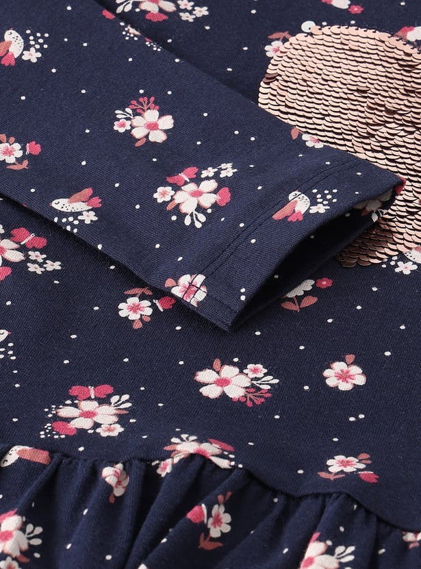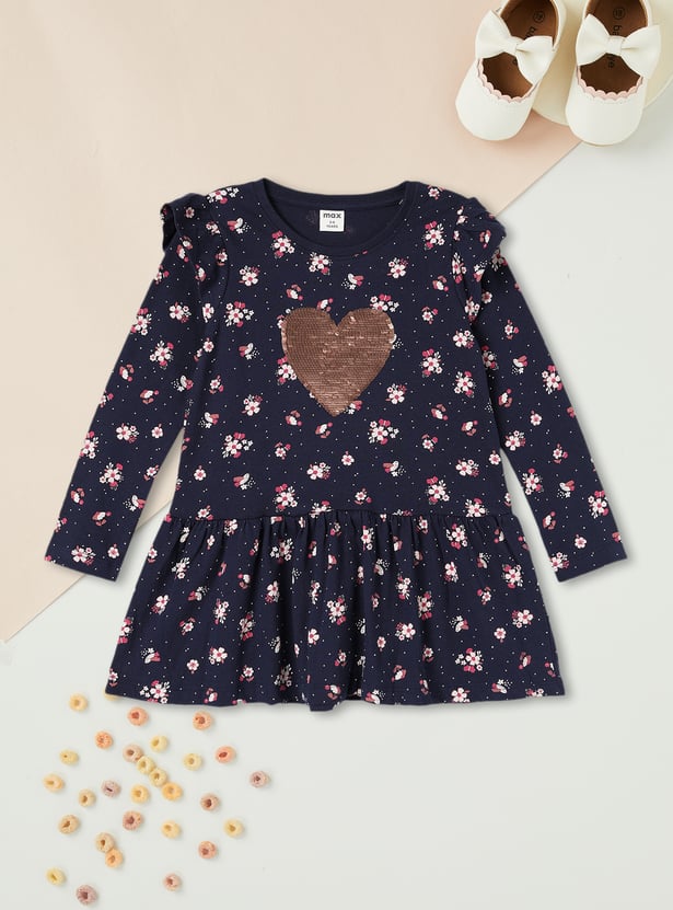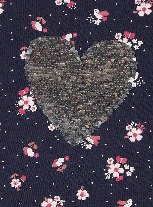 Double the fun and sparkle with this top. Featuring a vibrant all-over floral print, this top boasts reversible heart sequinned design that change colours with a simple swipe, adding a fun and interactive twist. It has ruffle detailing on the shoulder, gathered detailing, and a peplum hem.
