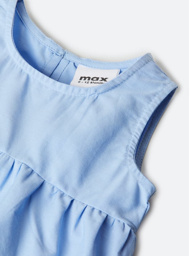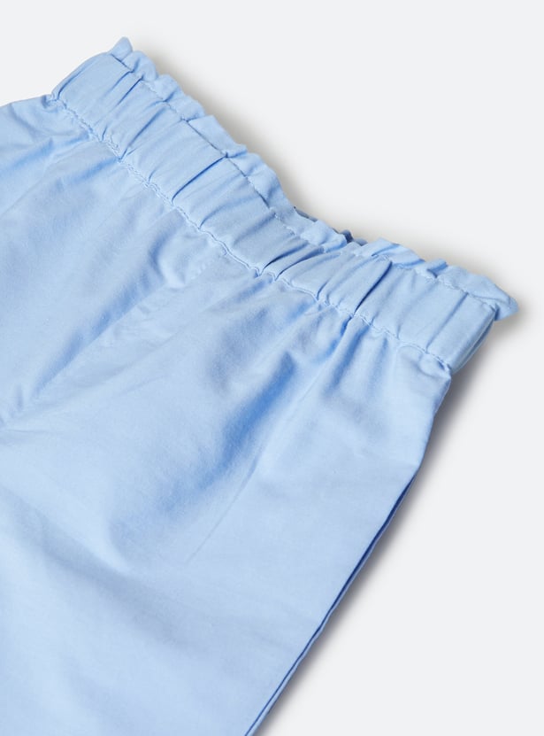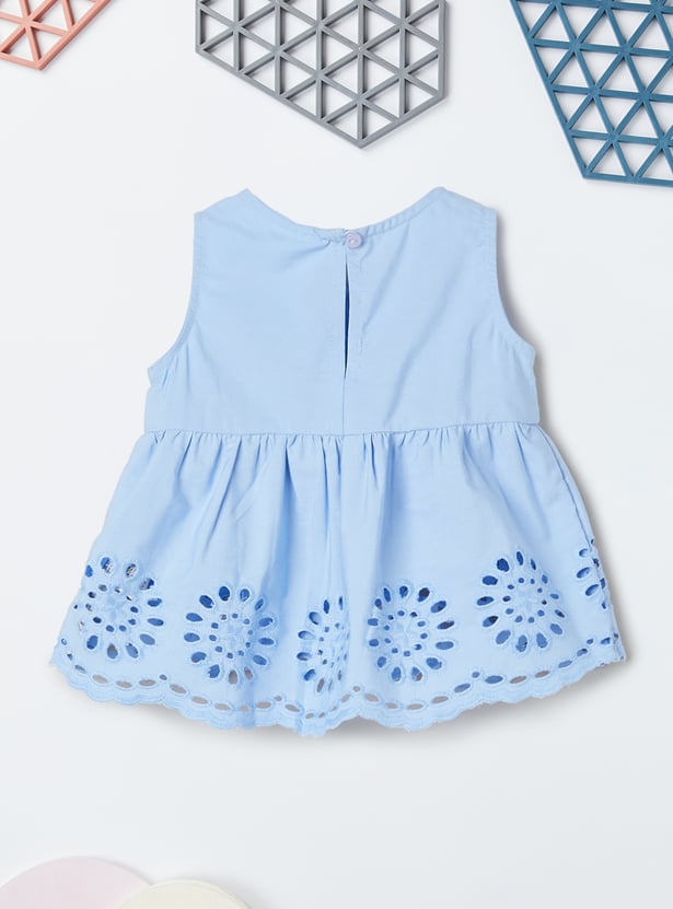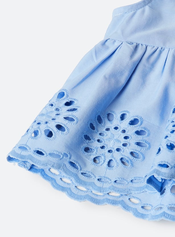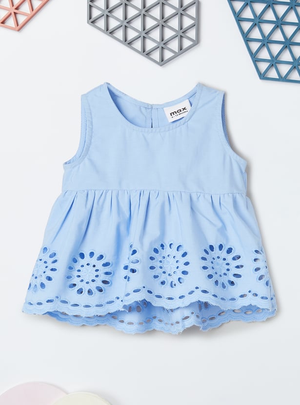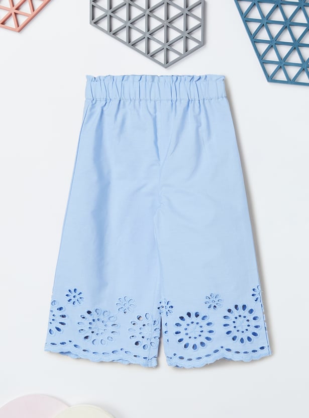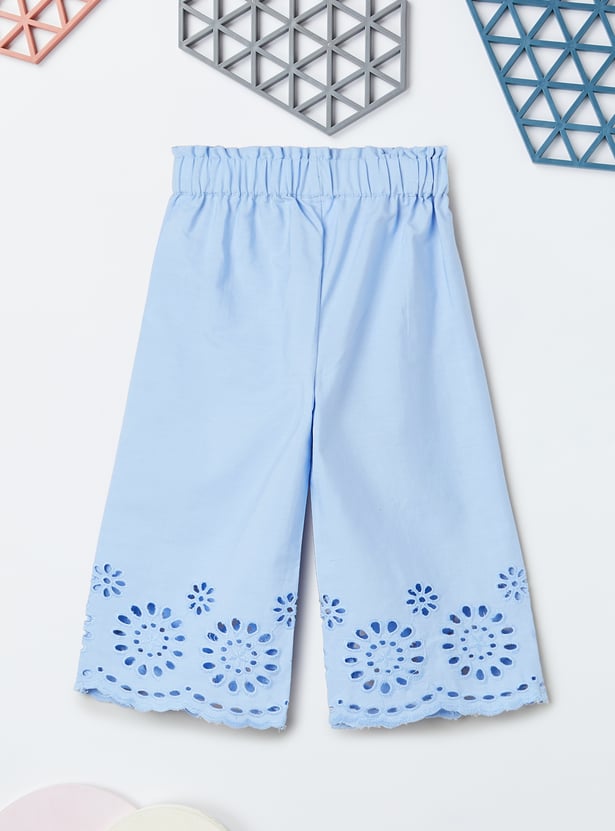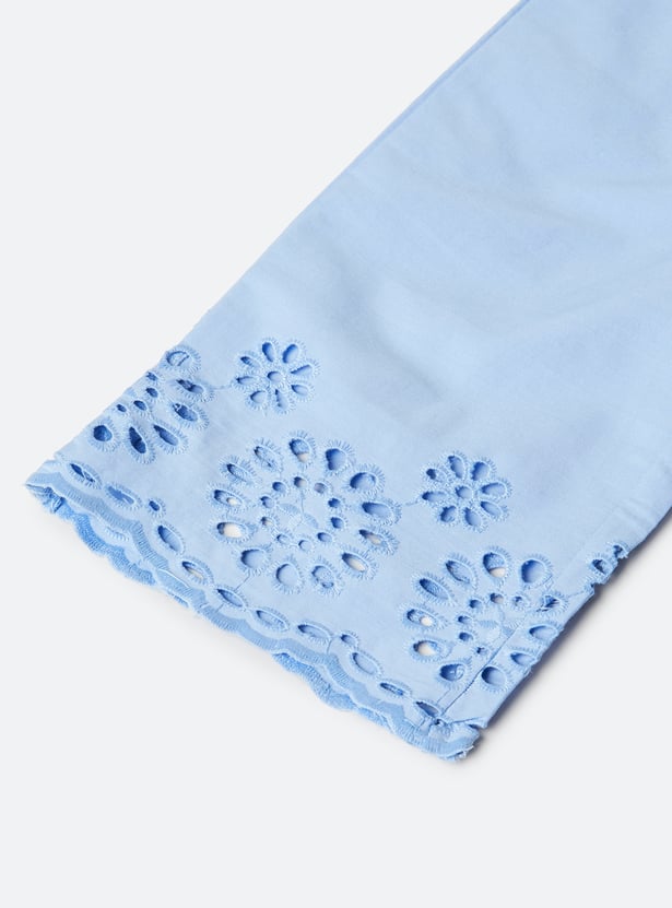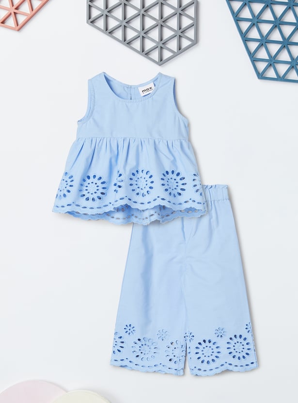 This schiffli embroidered co-ord set features a beautifully detailed schiffli top with a round neck and sleeveless design for a chic, breezy look. The elasticated waist adds comfort, while the matching schiffli trousers complete the set, offering a stylish and coordinated outfit for any occasion.