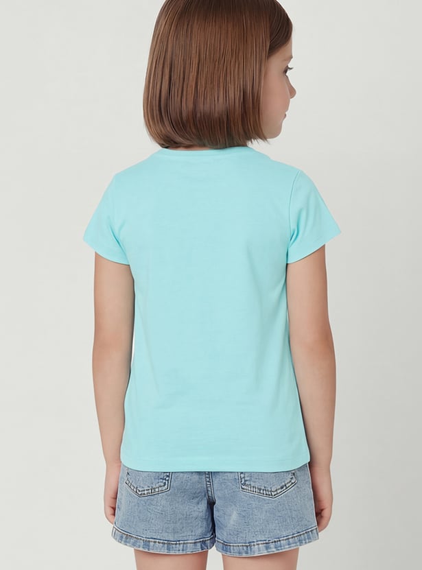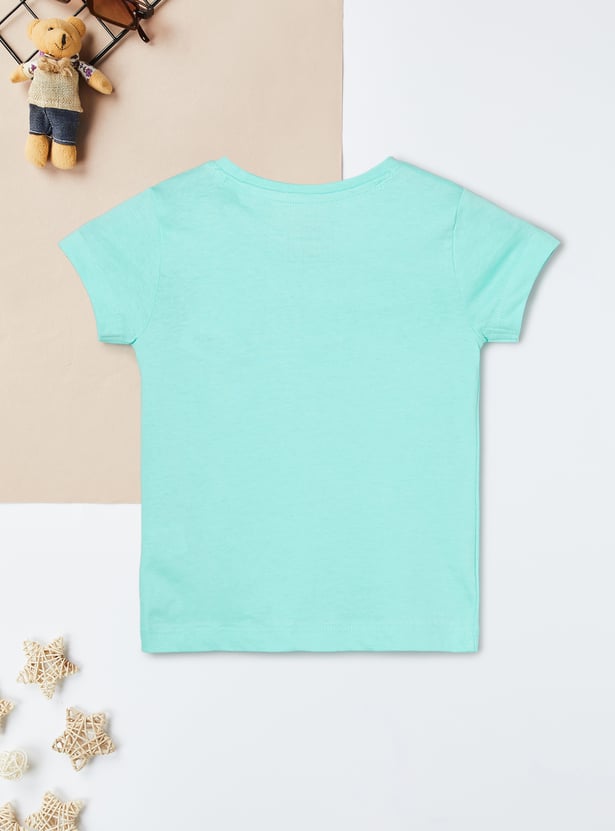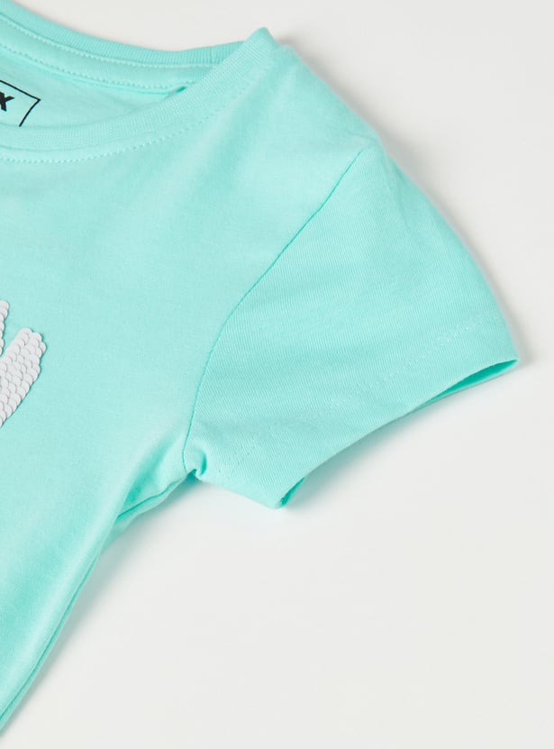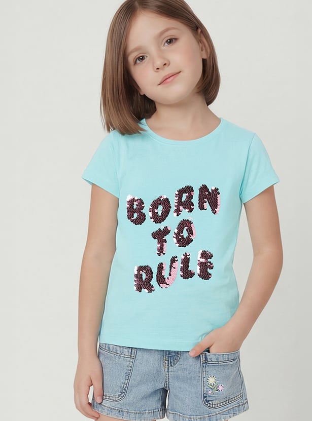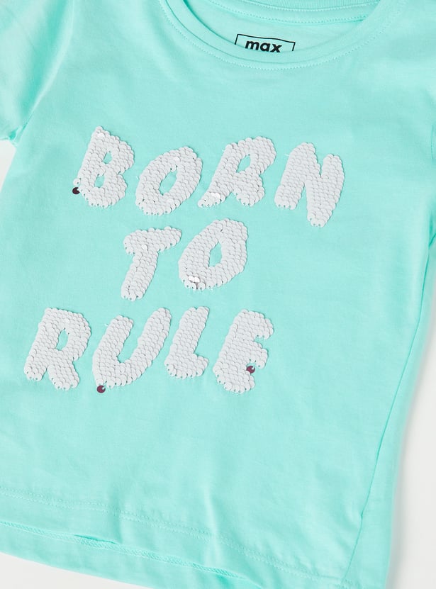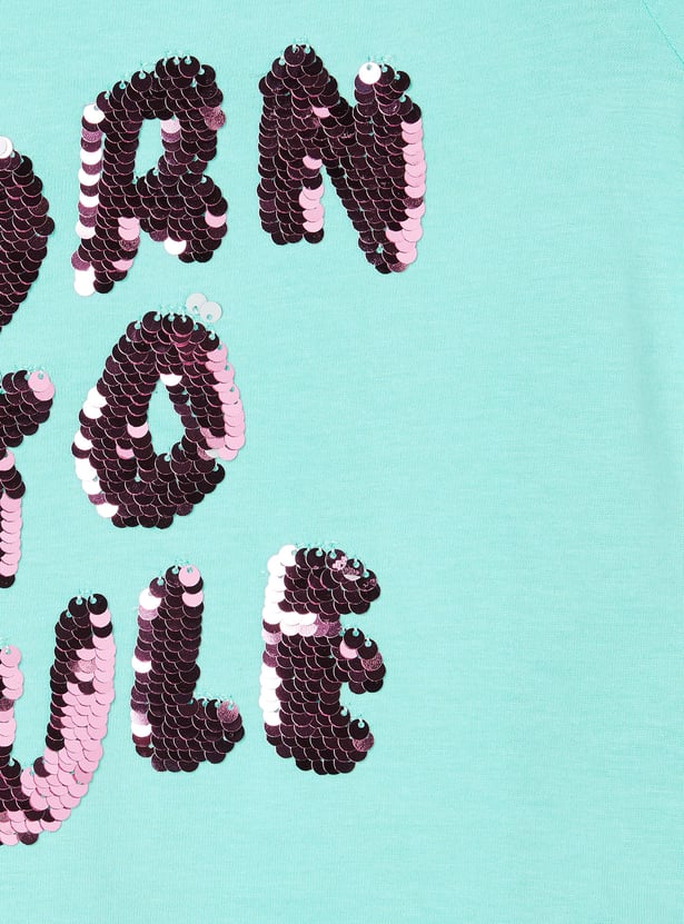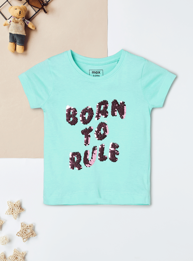 Sparkle meets comfort in this stylish T‑shirt featuring a round neck, half sleeves, and shimmering sequin-embellished detailing. Perfect for parties, playdates, or casual outings, it adds a touch of glam to her everyday look.