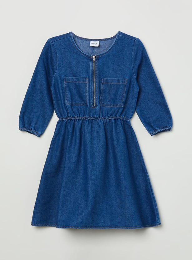 Styled with a solid surface, this denim A-line dress will make your little one look chic and stylish at the same time. The cinched-waist construction, zip closure, and three-quarter sleeves make it a perfect pick for casual outdoor settings.