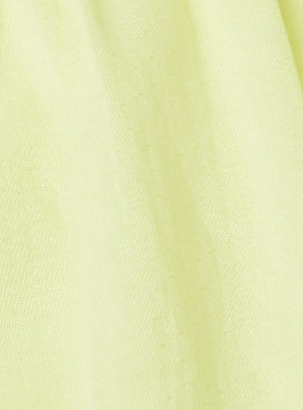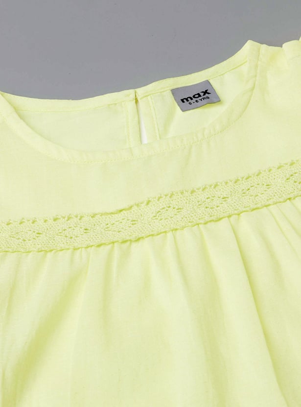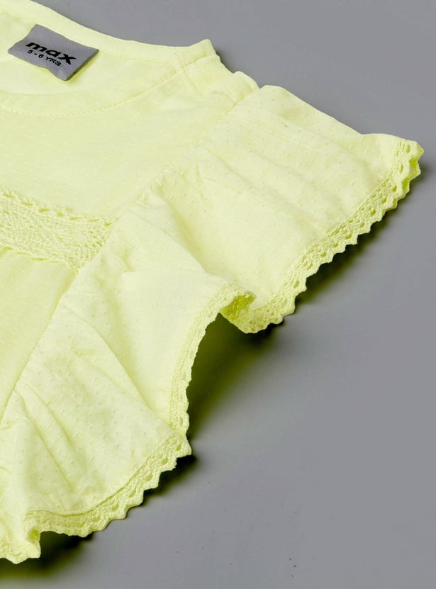 Dress your little one in comfort and style with this chic solid top. It features a classic round neck, keyhole button closure, and flutter sleeves with lace details for an effortlessly elevated look.