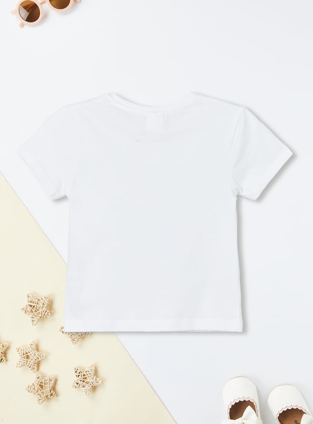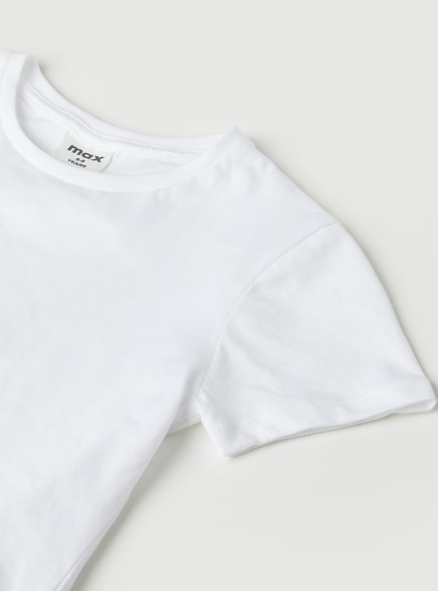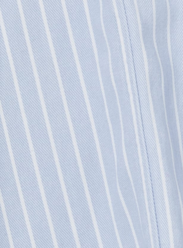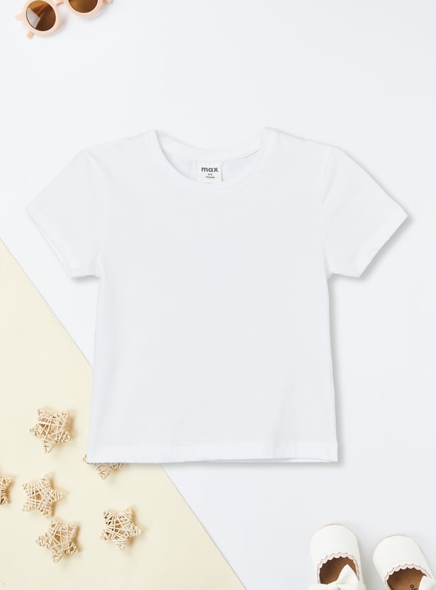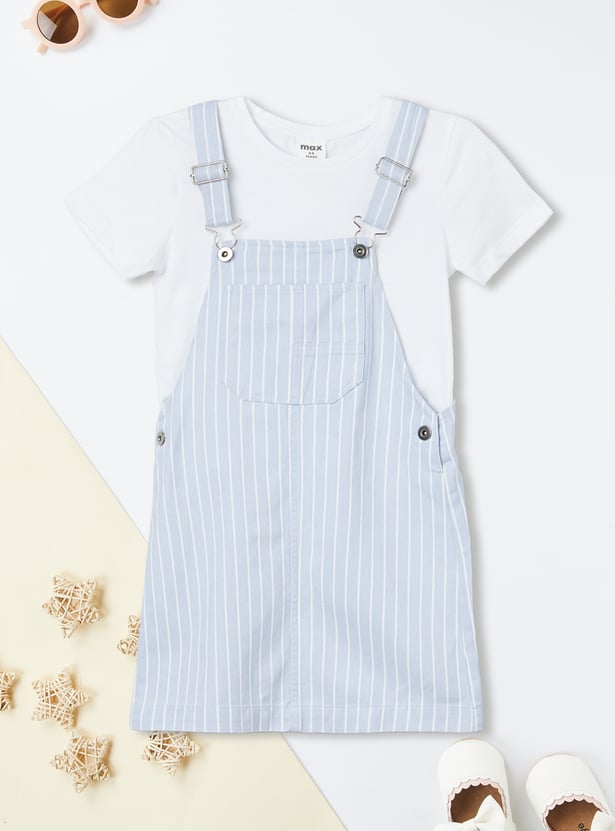 Chic and playful, this striped pinafore dress is designed with suspenders, a round neck, and button closure for a trendy layered look. It comes paired with a solid T-shirt featuring a round neck and half sleeves, making it a versatile set for casual outings