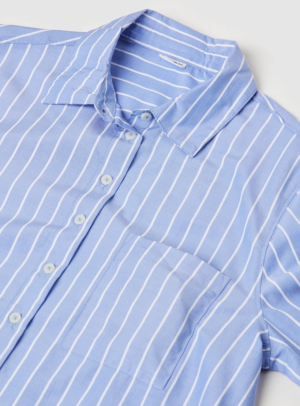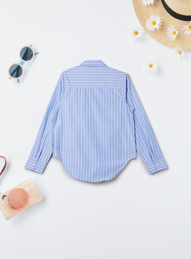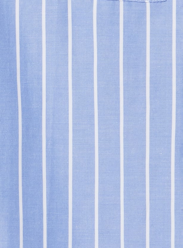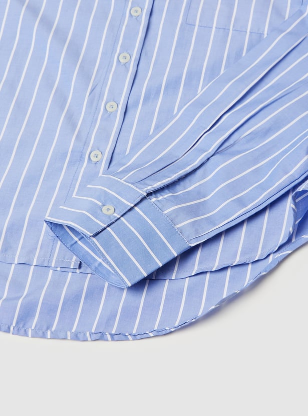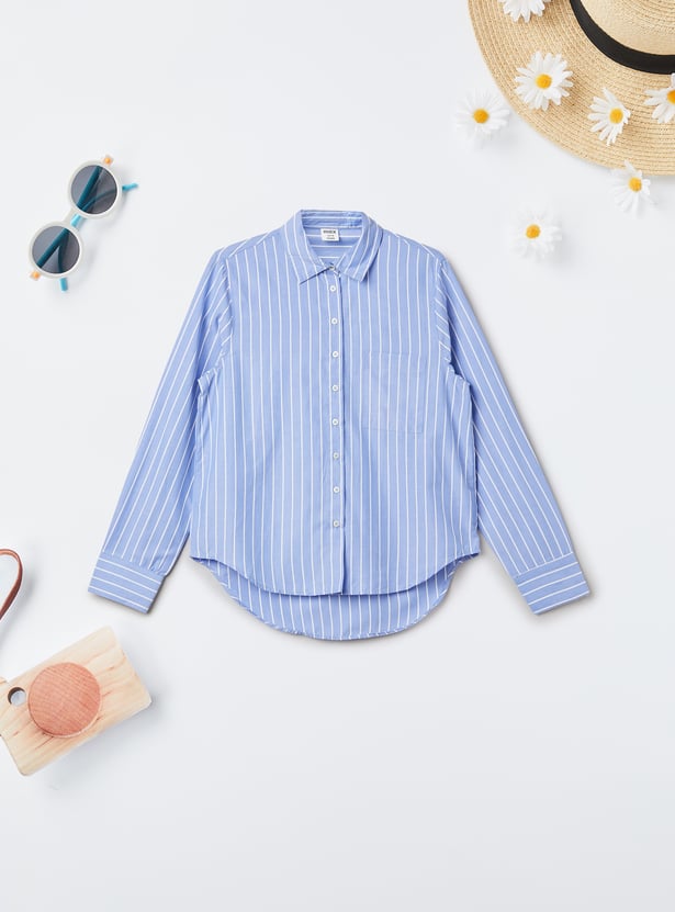 This striped shirt features a spread collar, full sleeves with buttoned cuffs, and a curved hem for a tailored yet relaxed fit. Crafted from breathable fabric, it’s perfect for any occasion.