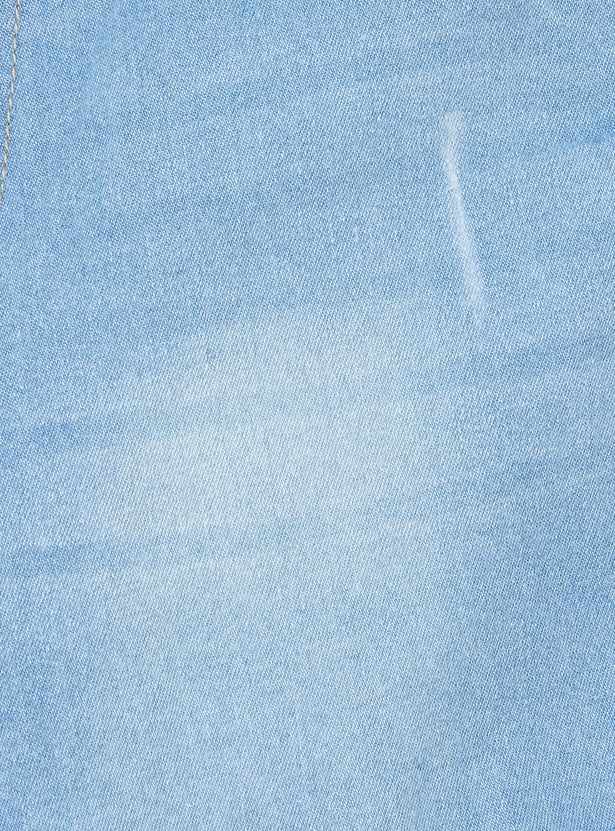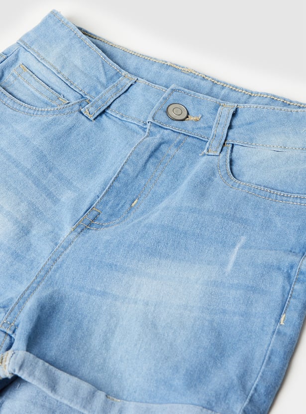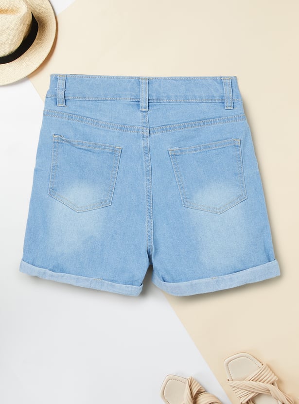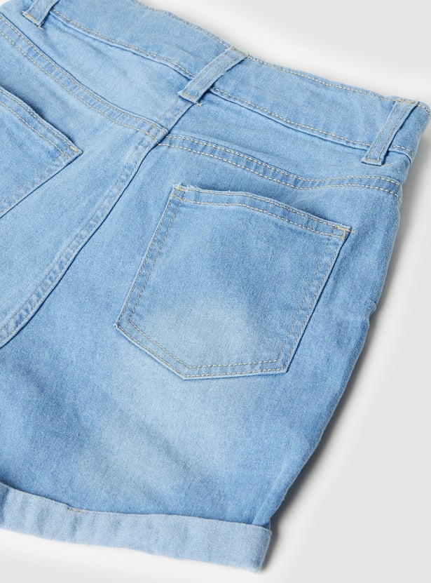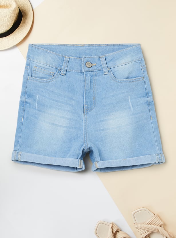 These washed denim shorts offer a laid-back vibe with a classic button closure, mid-rise, and functional pockets. The faded finish adds a cool, lived-in look perfect for casual days.