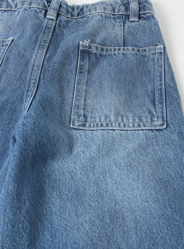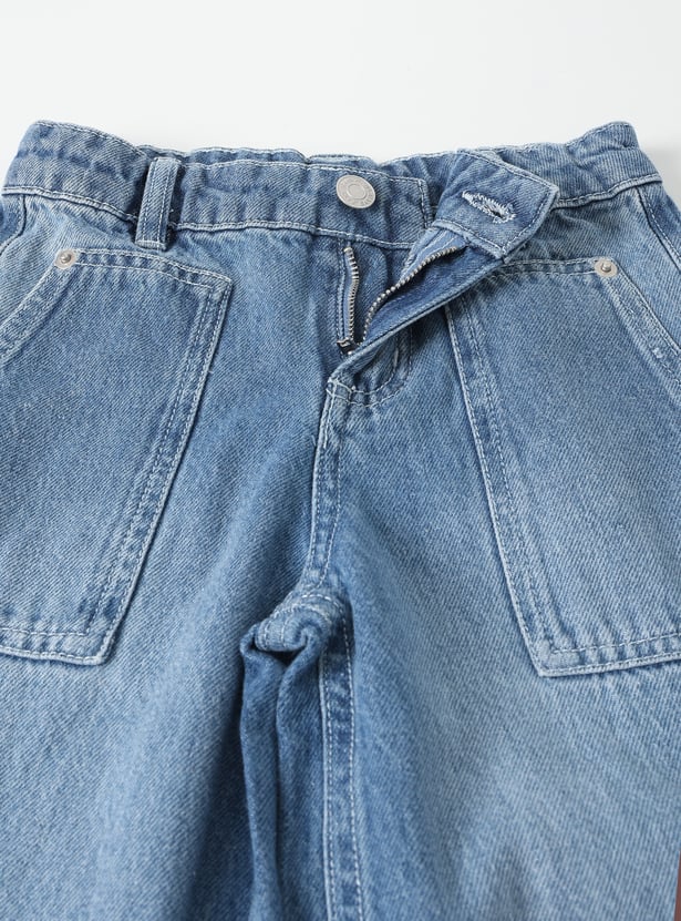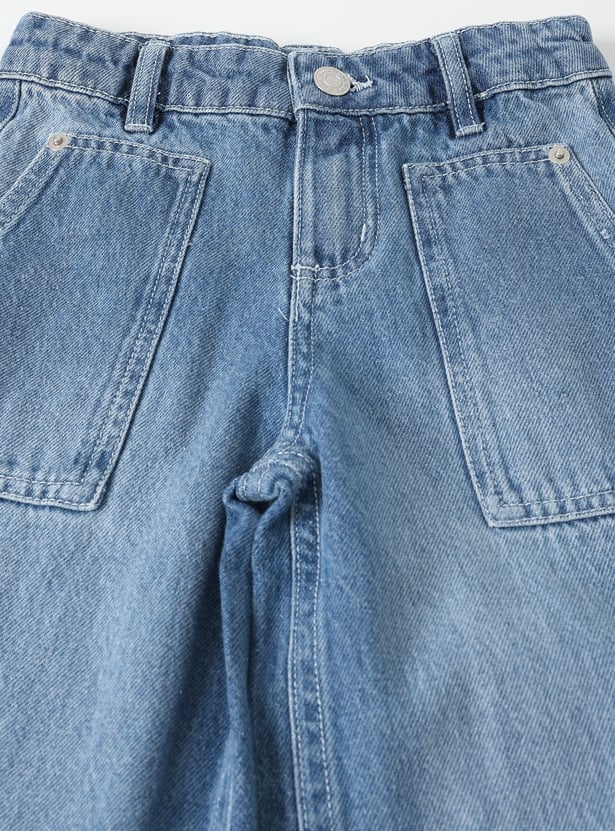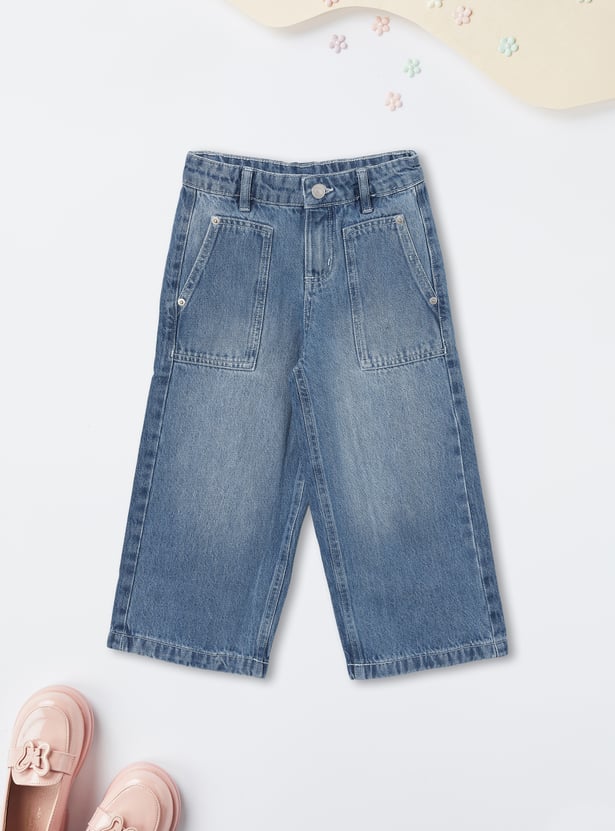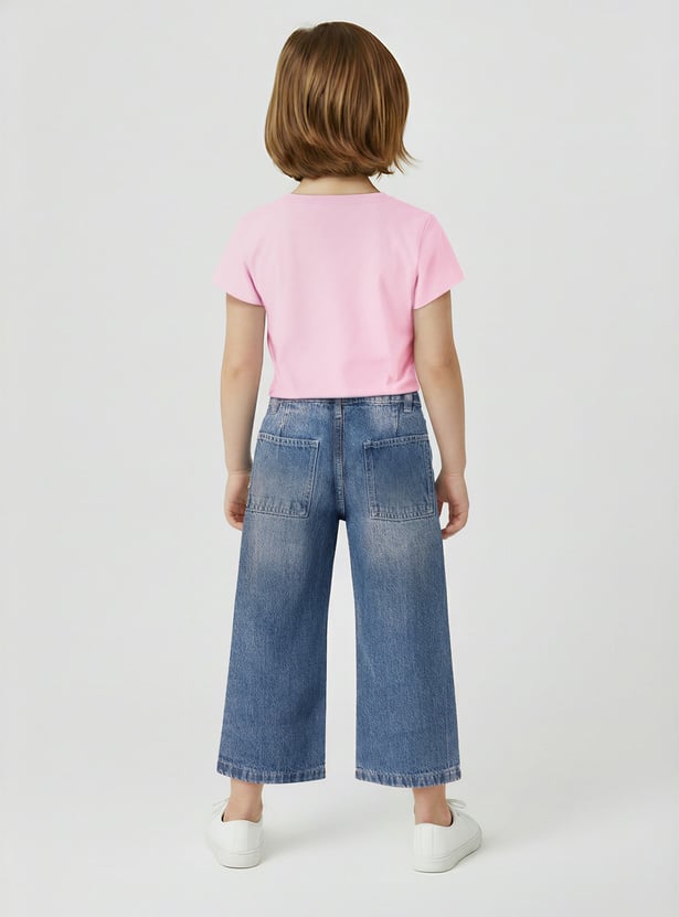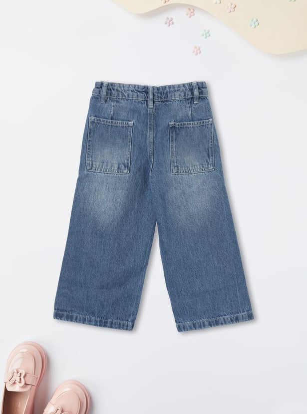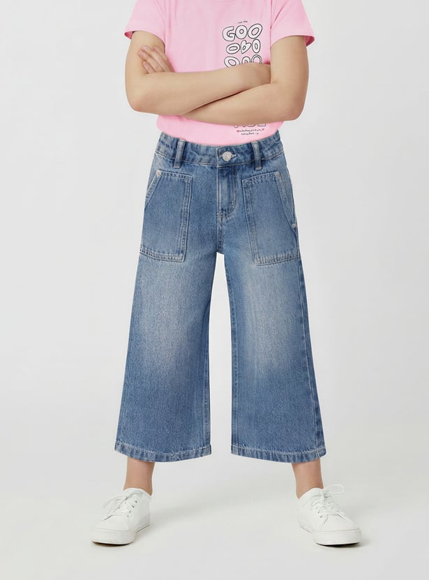 These girls jeans feature a mid-rise, straight fit with a wide-leg silhouette and ankle-length cut for a trendy, comfortable style. The washed denim design makes them versatile for everyday wear.