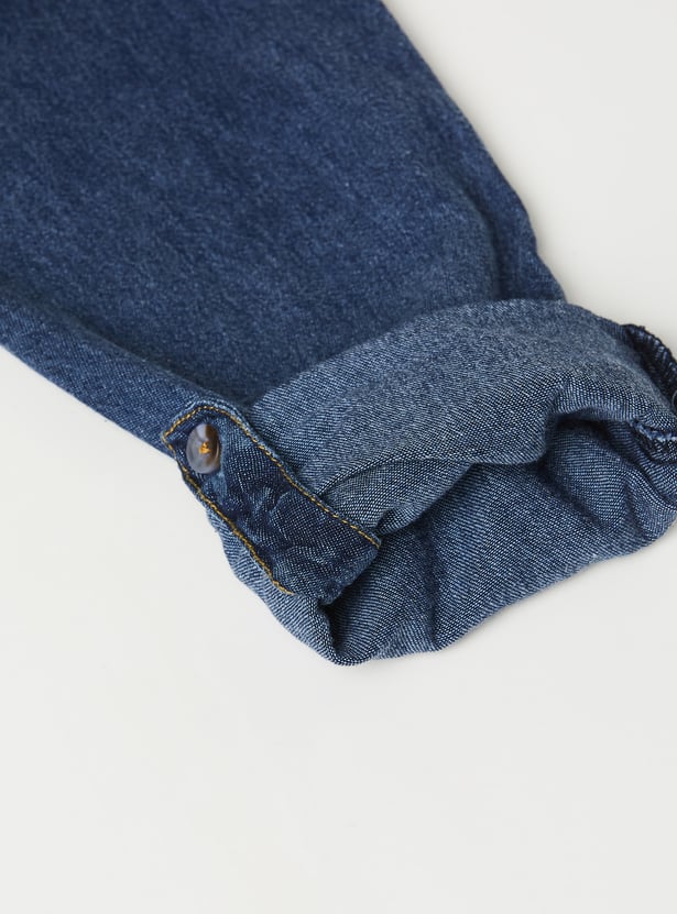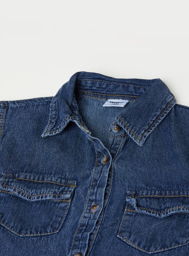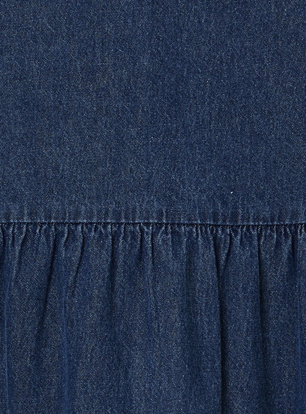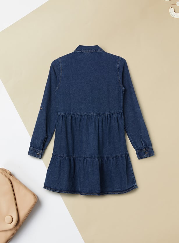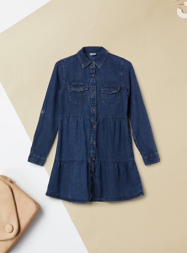 Add a casual-chic touch to your wardrobe with this washed tiered denim dress. Featuring a spread collar, button placket, full sleeves with fold tabs, and a tiered design, it offers effortless style and comfort.