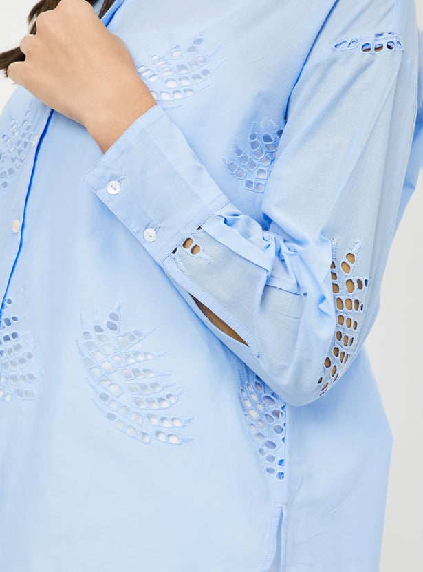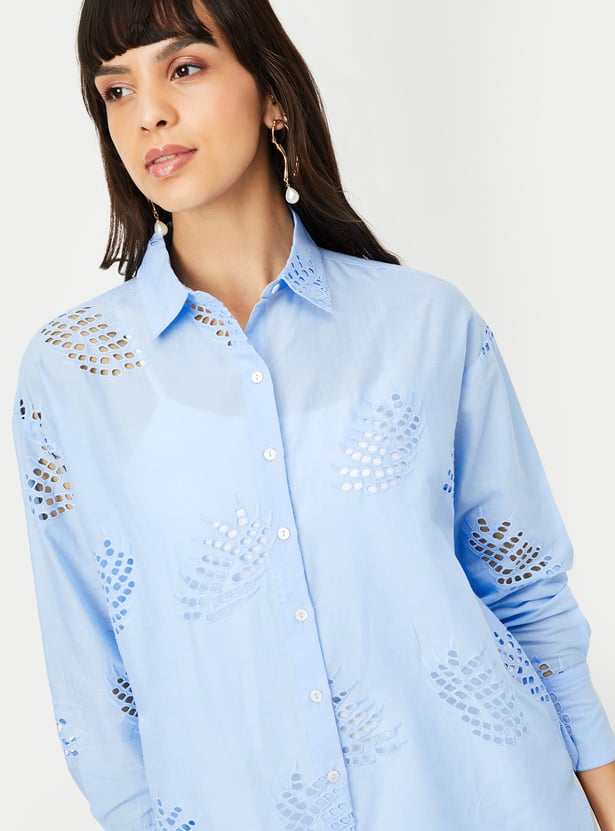 Make a statement with this Schiffli embroidered oversized shirt, featuring a spread collar, button placket, and full sleeves with button cuffs. The intricate embroidery adds a touch of elegance, making it perfect for both casual and semi-formal occasions. Model Size :