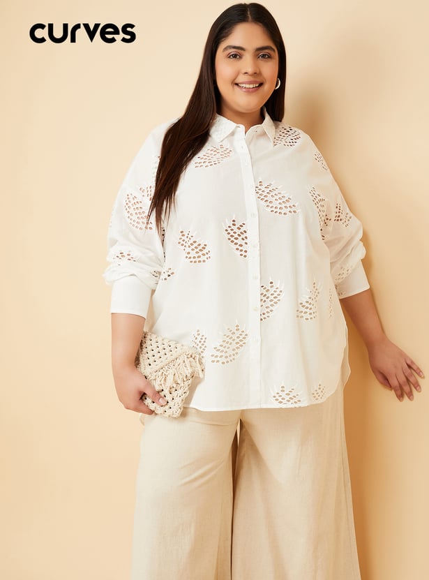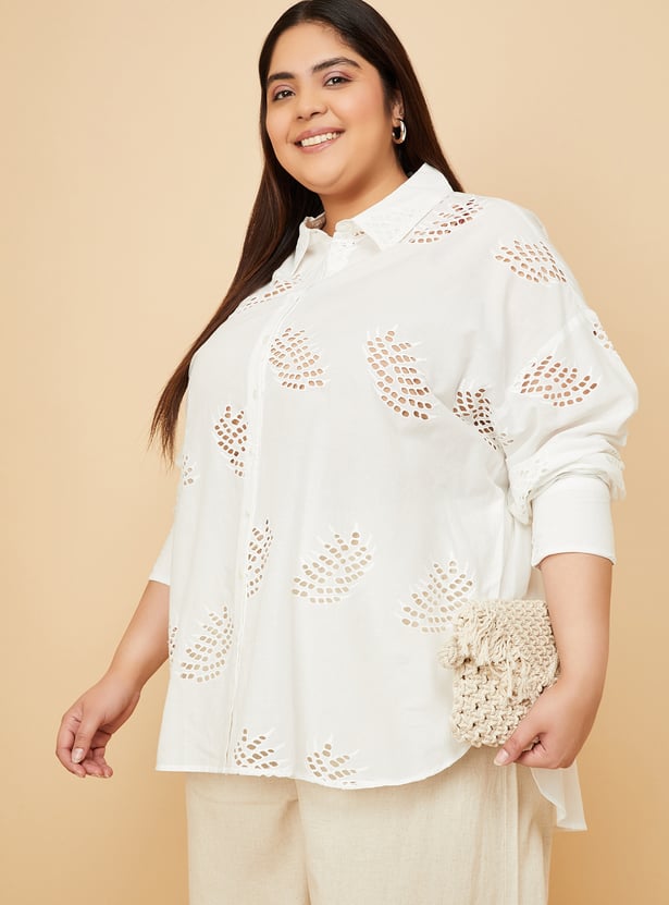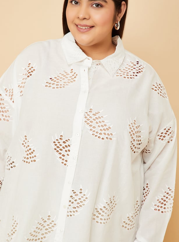 Make a statement with this Schiffli embroidered oversized shirt, featuring a spread collar, button placket, and full sleeves with button cuffs. The intricate embroidery adds a touch of elegance, making it perfect for both casual and semi-formal occasions. Model Size :