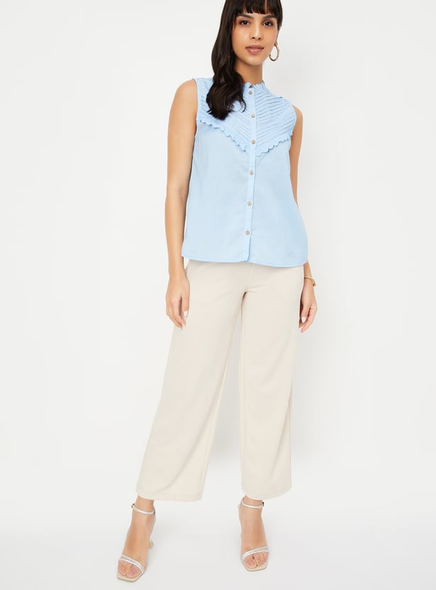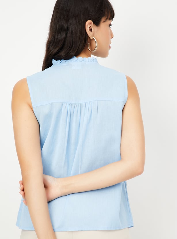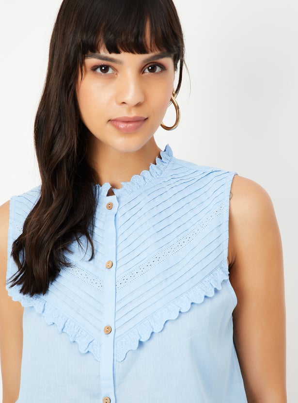 This top exudes elegance with a pin tuck detail on the yoke along with lace, band collar and a button closure, offering a chic sleeveless design. It’s the perfect combination of delicate detail and effortless style. Model Size :