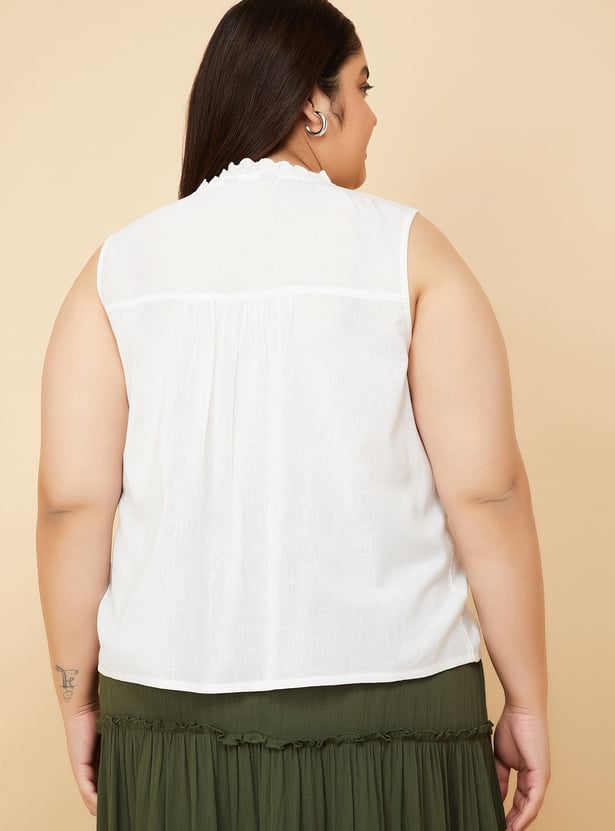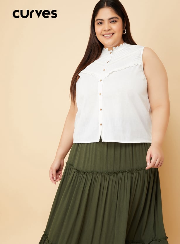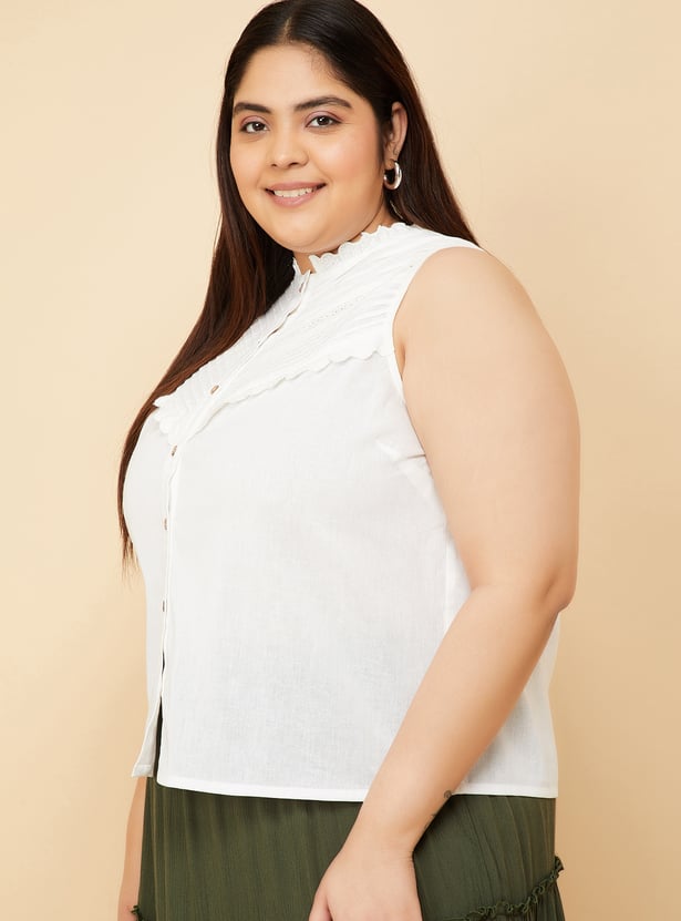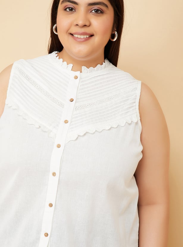 This top exudes elegance with a pin tuck detail on the yoke along with lace, band collar and a button closure, offering a chic sleeveless design. It’s the perfect combination of delicate detail and effortless style. Model Size :